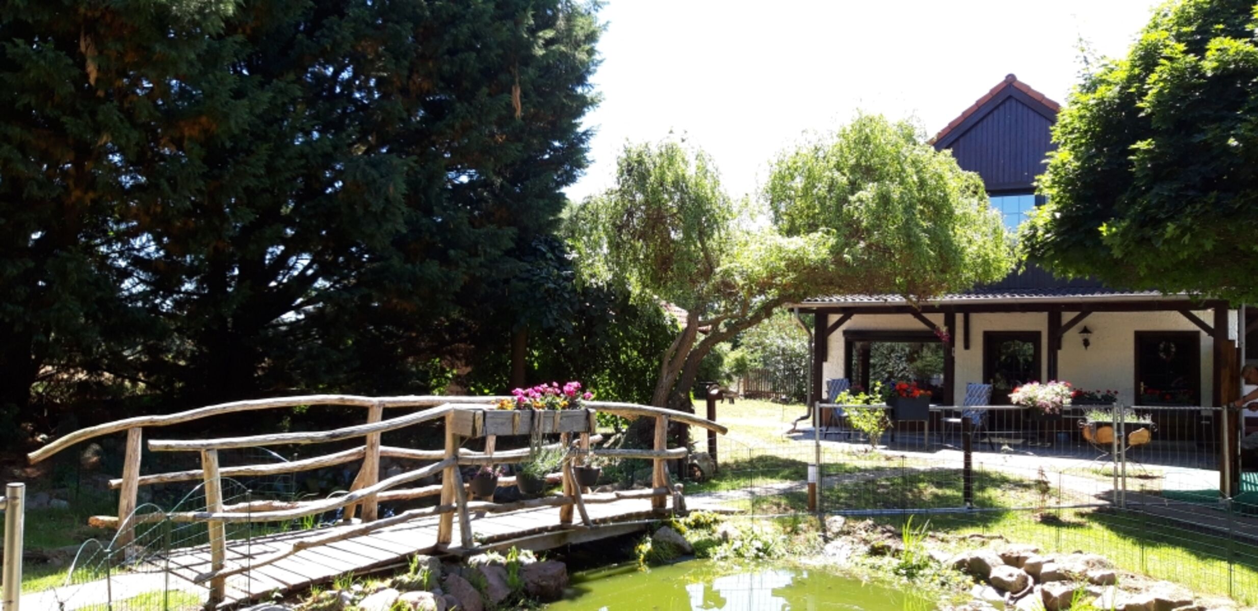 Im vorderen Gartenteil befindet sich ein naturbelassener eingezäunter Teich mitsamt "Bewohnern", wie z.B. Fischen, Fröschen, Libellen usw.