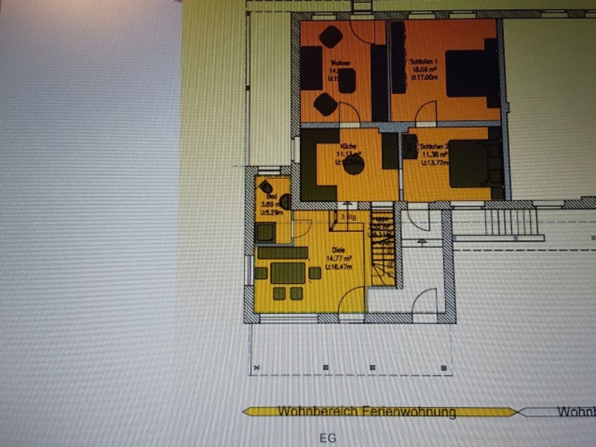 Im EG des Ferienhauses befindet sich die Diele mit anschließendem Essbereich, die Küche, Dusche/WC, Schlafzimmer 1 und 2 (ist Durchgangszimmer zu SZ 1), Wohnzimmer mit Terrassentüre zum hinteren Gartenteil. Die Gästewaschmaschine befindet sich in einem extra Raum und kann gerne kostenlos genutzt werden. Die Schlüssel dazu gibt es bei den Vermietern. Bringen Sie bitte selbst Waschmaschinencaps mit, kein Pulver!