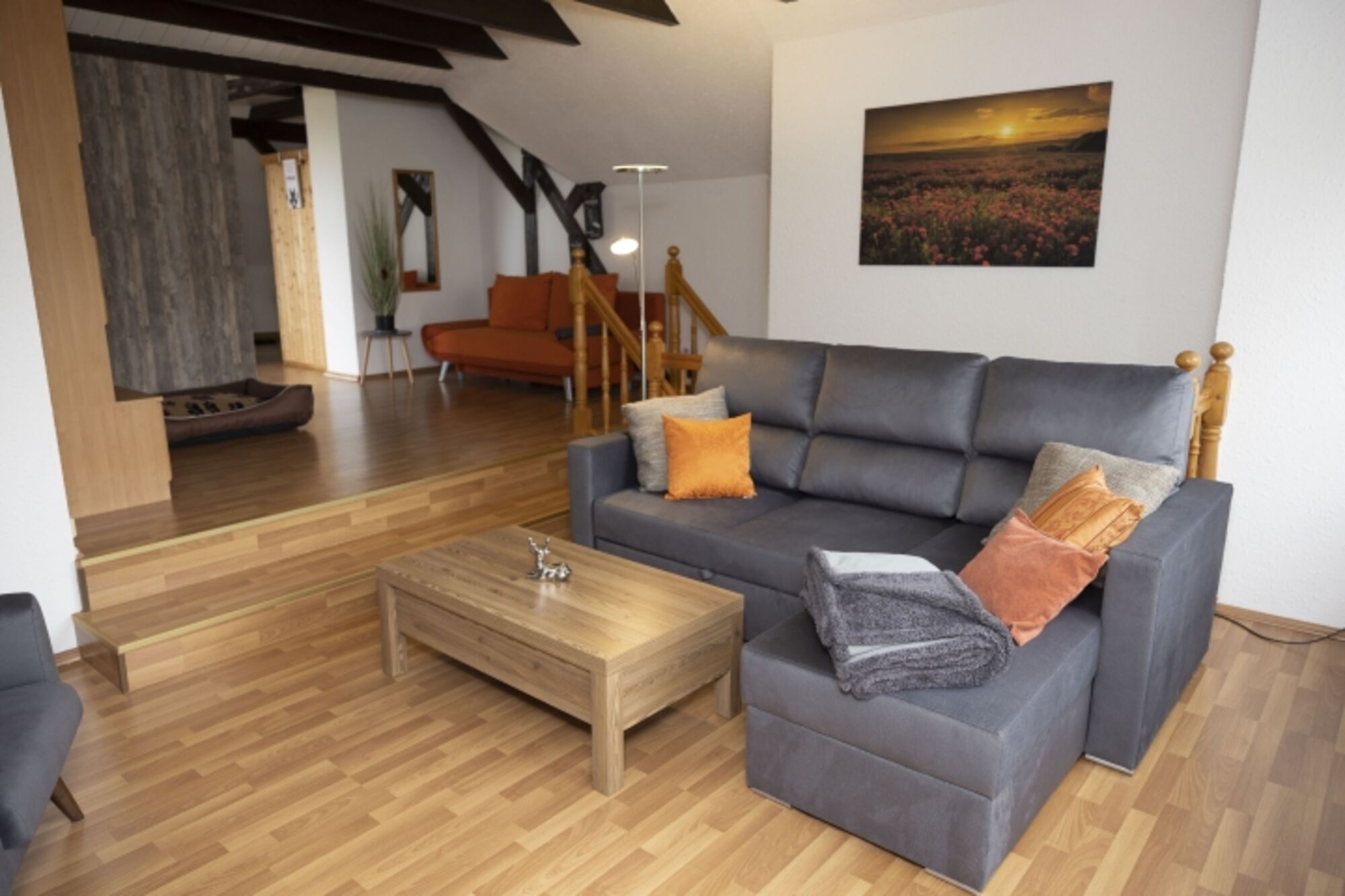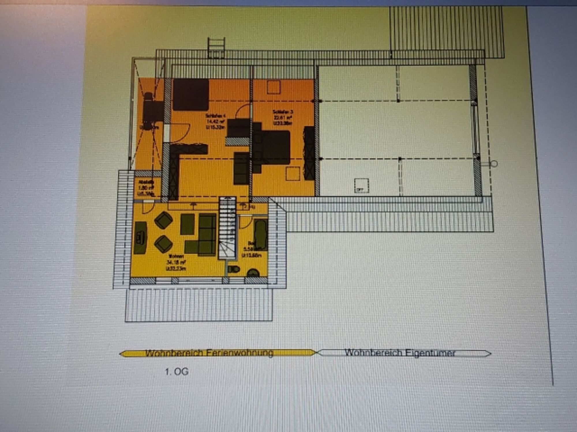 Im 1. OG befindet sich das Wohnzimmer mit 2 Stufen, Leseecke, Schlafzimmer 3 und 4 (4 ist Durchgangszimmer zu SZ 3) mit Zugang zum Balkon (mit Balkonmöbeln) und mit Teilblick -je nach Jahreszeit- auf den Fluß Oder, Bad/WC mit Badewanne, Infrarotkabine für 1-2 Personen, diverses Fitnesszubehör.