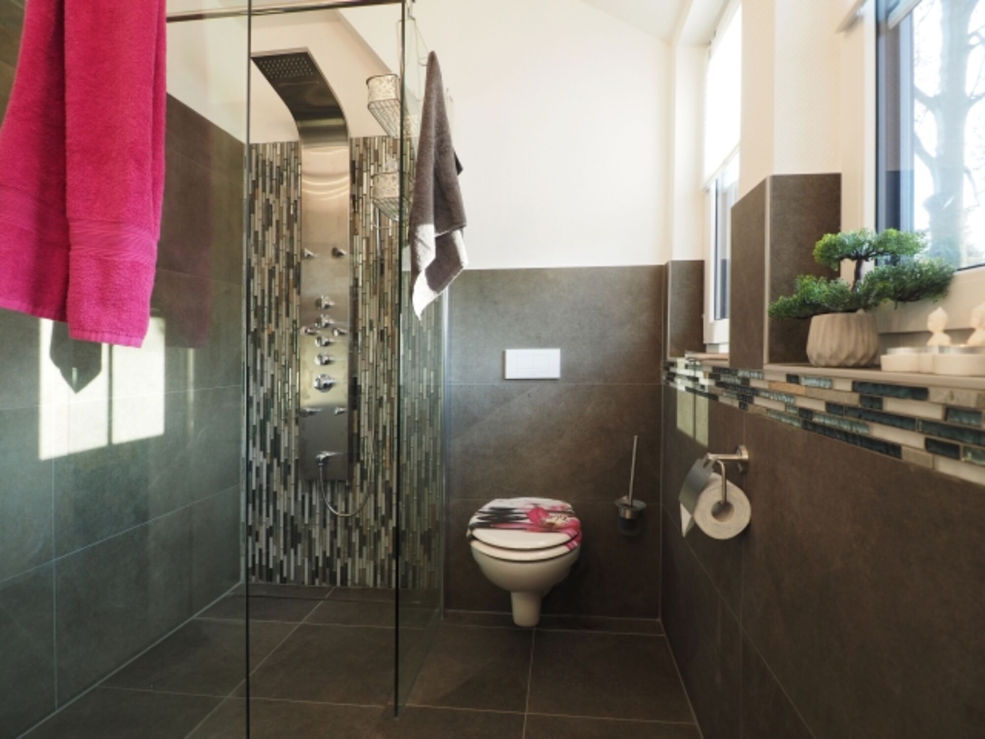 Massagedusche, Regendusche, Spiegel, Fenster im Bad