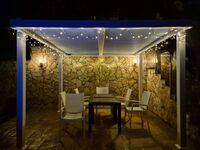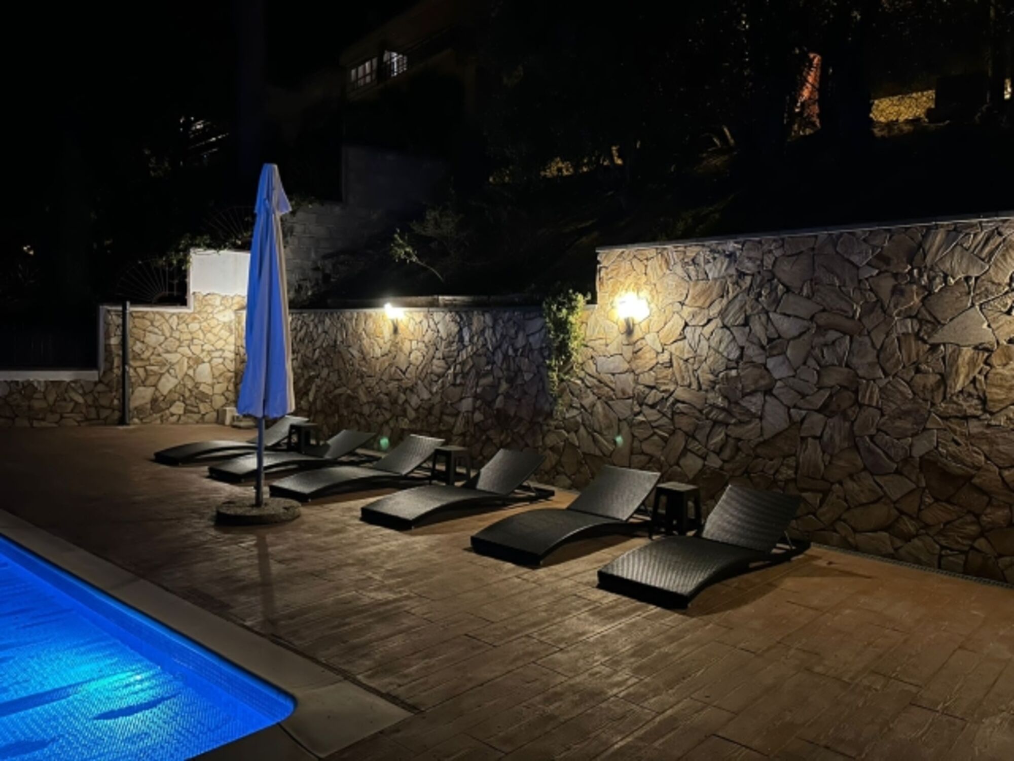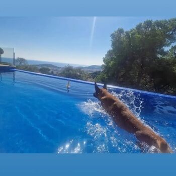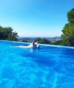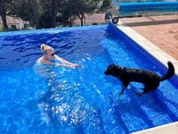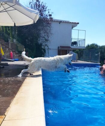 Privater Pool 28 m², 3,5 x 8 m Infinity, Salzwasser, mit Unterwassersitzbank und gemauerter Treppe in den Pool, dass auch ungeübte Hunde und ältere Leute einfach wieder herauskommen, mit grosser Poolterrasse (über 80 m²). Bei der Wasseraufbereitung wird auf den Einsatz von Chemi-Tabletten komplett verzichtet. Es kommt eine moderne Elektrolyseanlage zum Einsatz. Das Wasser ist dadurch ganz leicht salzig und sehr haut- und augenfreundlich. Poolheizung auf Wunsch (gegen Aufpreis, 150€ pro Woche (im Winter mehr)), so dass von April bis Oktober angenehme Temperaturen (bis 30º) im Pool sind.