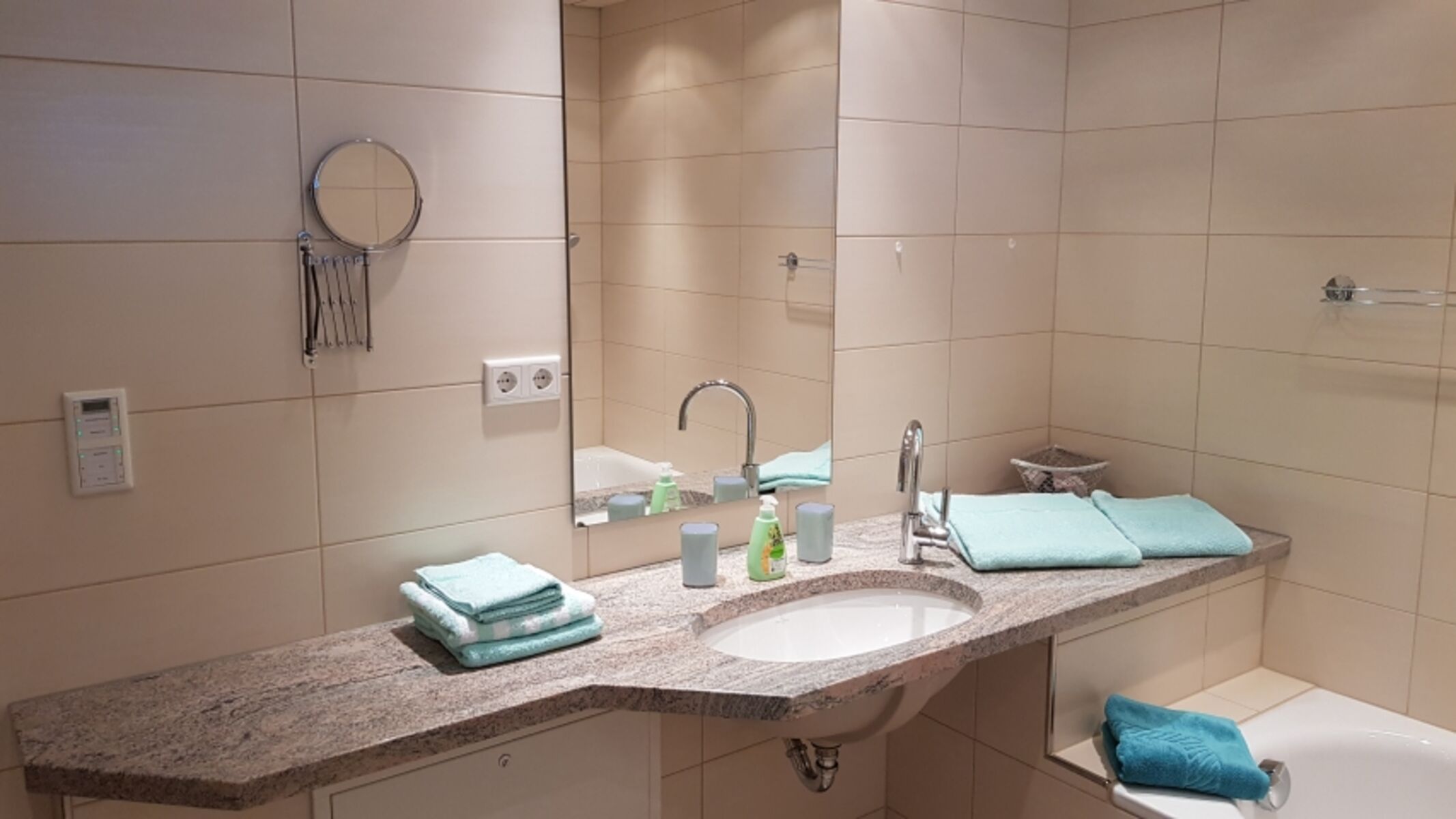 Fußbodenheizung und Handtuchwärmer Waschbecken, Regendusche, Kosmetiktücher, Spiegel, Fenster im Bad