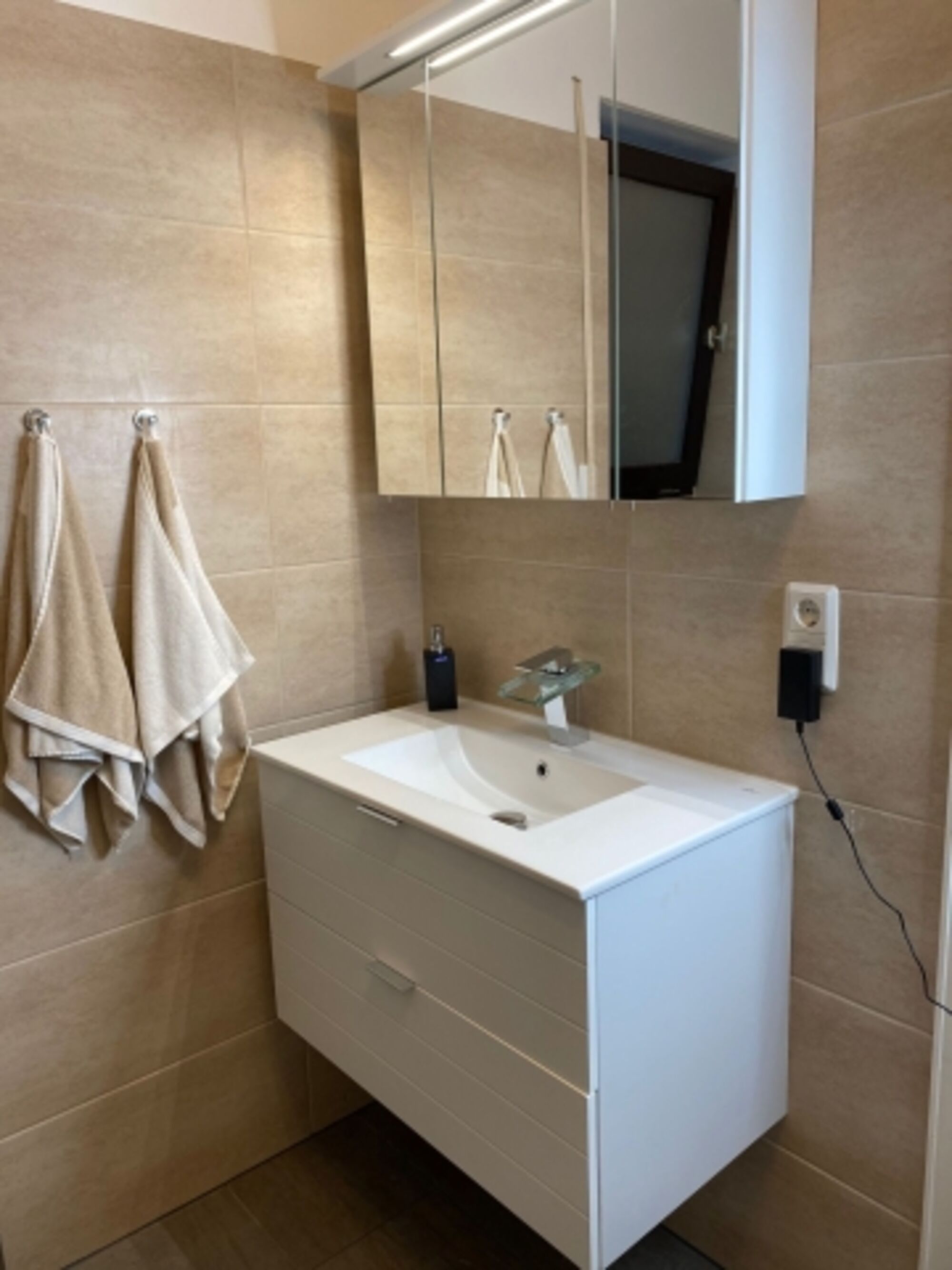 Waschbecken, Regendusche, Spiegel, Fenster im Bad