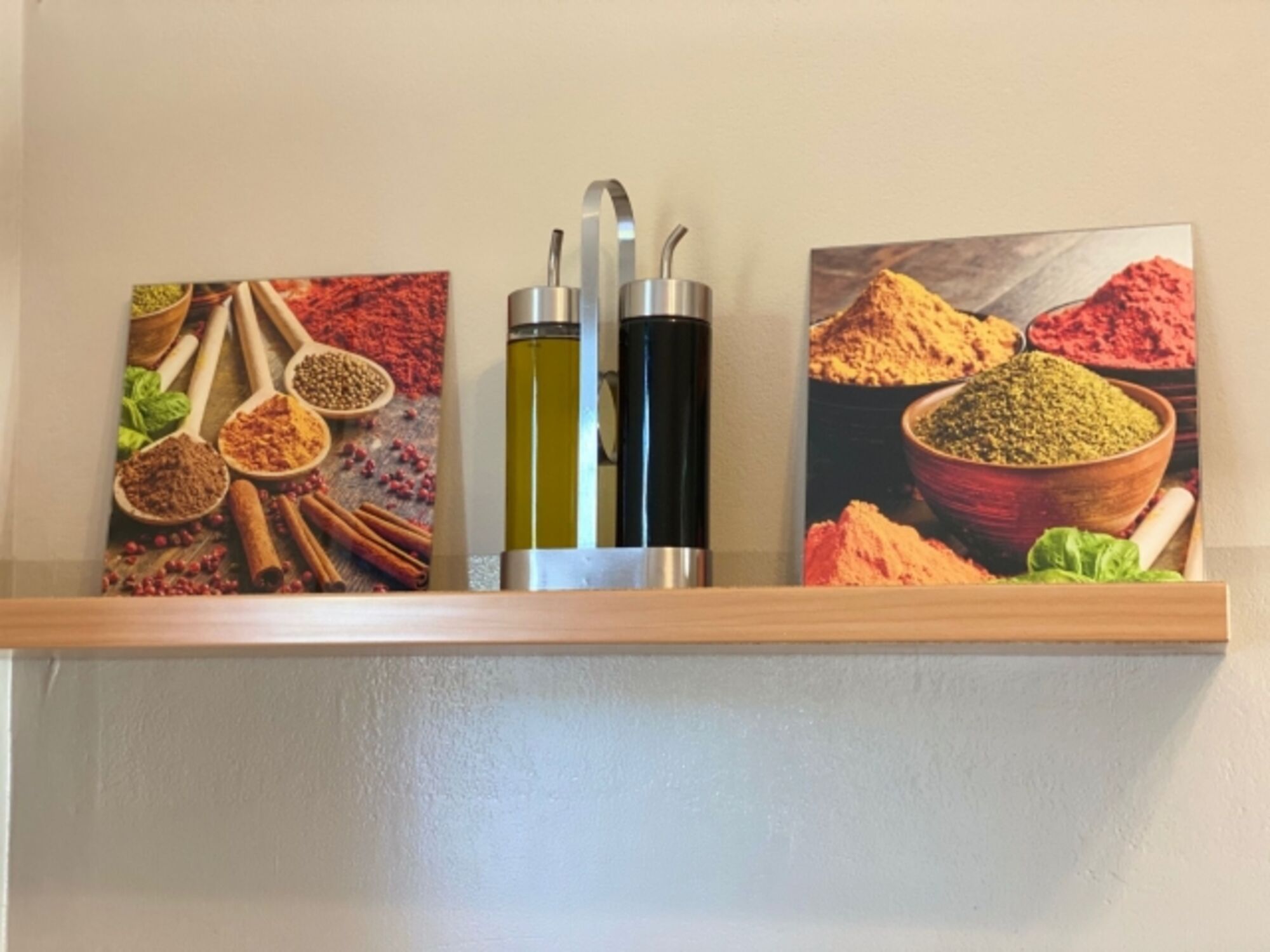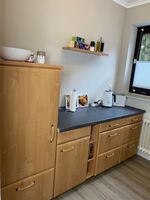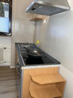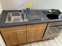 4-Platten Herd, Cerankochfeld, Kühlschrank mit Gefrierfach, Gewürze (Salz, Pfeffer, Zucker), Öl / Essig, Geschirrhandtücher, Mülltüten
