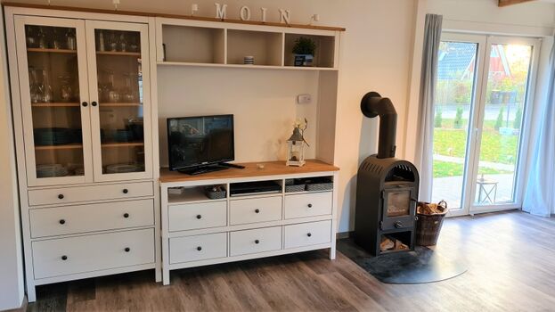 TV-Sat, TV-Flachbildschirm, Bücher, Kaminofen, 3er-Sofa, 2er-Sofa, Sessel