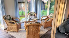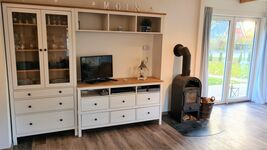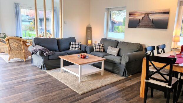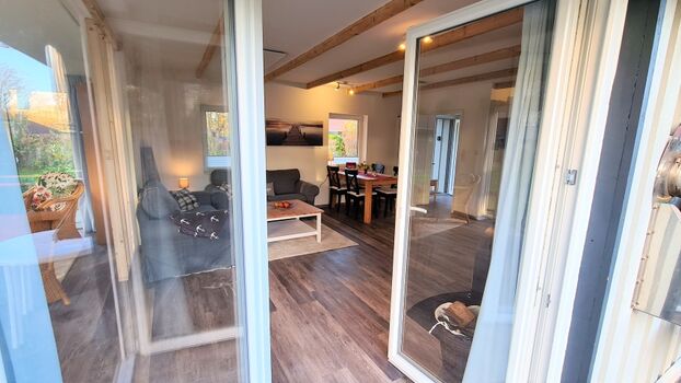 Mit 75m² bietet es großzügig Platz für bis zu 4 Personen. Der helle Wohn-und Essbereich mit offenem Wintergarten und angeschlossener offener Küche strahlt schon beim Betreten Gemütlichkeit und Urlaubsstimmung aus. Von hier aus gelangen Sie auf die sonnige Terrasse und in den vollständig eingezäunten, geschützten Garten, der perfekt geeignet ist, einfach mal abzuschalten, da auch Hunde und Kinder sich hier frei bewegen können, ohne die Angst, dass sie sich beim Nachbarn wiederfinden. Die beiden Schlafzimmer,eines mit Doppelbett(140x200) und eines mit zwei Einzelbetten, die bei Bedarf zum Doppelbett zusammengestellt werden können, sowie das Bad mit Dusche befinden sich im hinteren Teil des Hauses und können durch eine Tür vom Wohnbereich getrennt werden, sodass Sie hier Ihren Rückzugsort für absolute Ruhe finden.