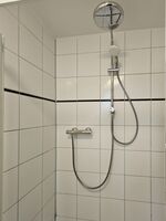 Waschbecken, Regendusche, Kosmetiktücher, Spiegel, Fenster im Bad