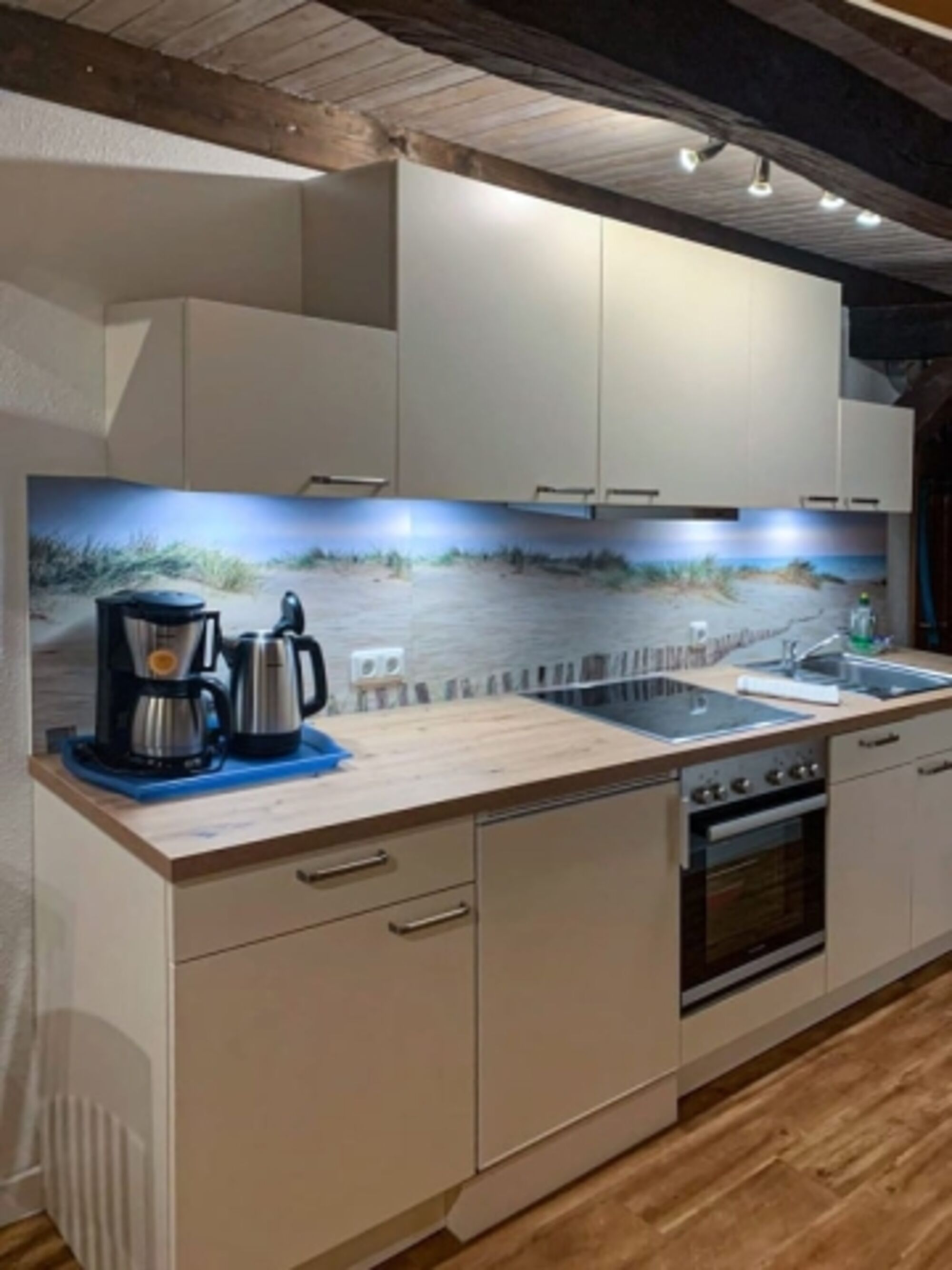 Cerankochfeld, Dunstabzugshaube, Kühlschrank mit Gefrierfach, Eierkocher, Korkenzieher / Flaschenöffner, Geschirrhandtücher, Mülltüten, Essplatz in der Küche