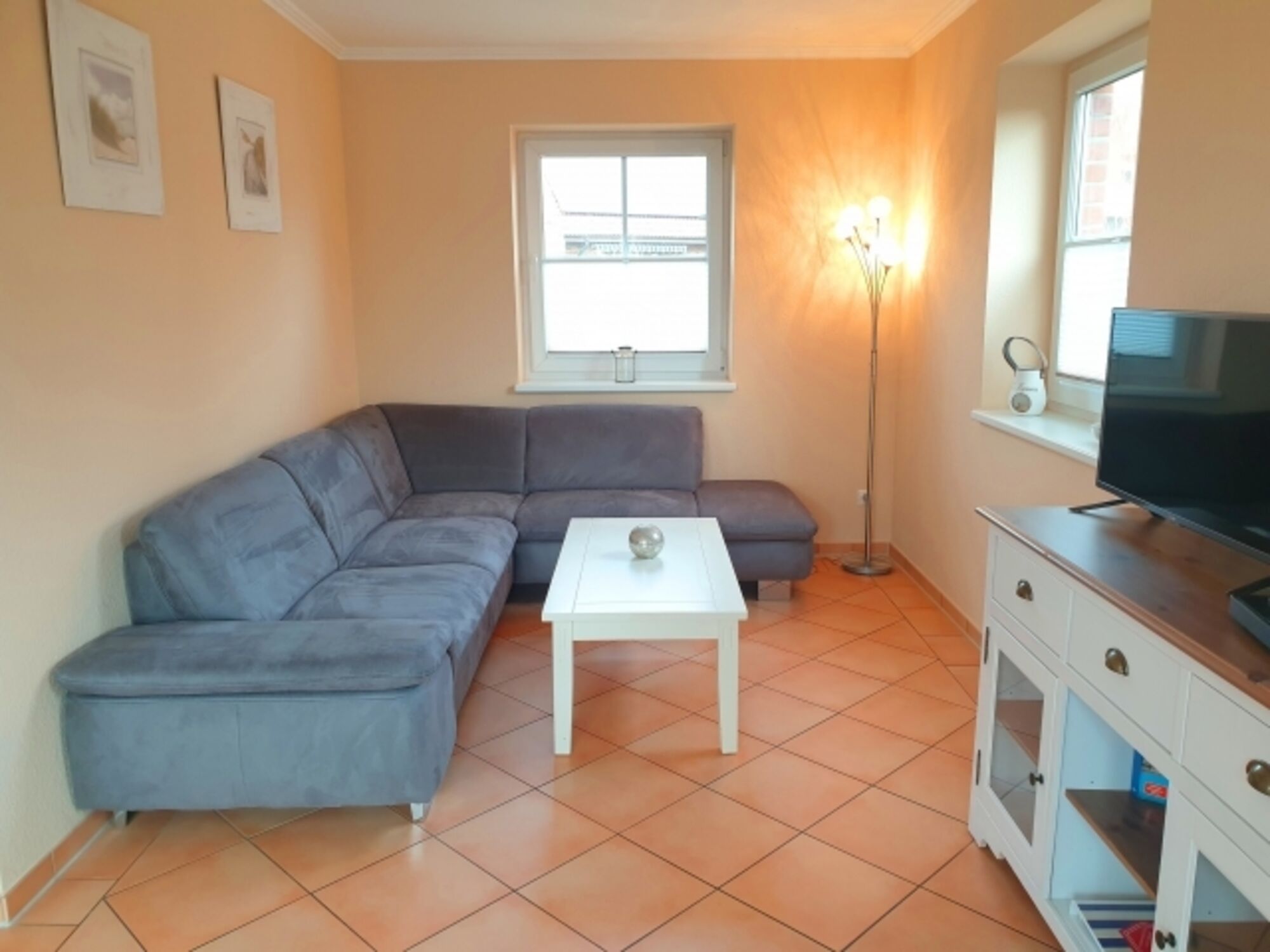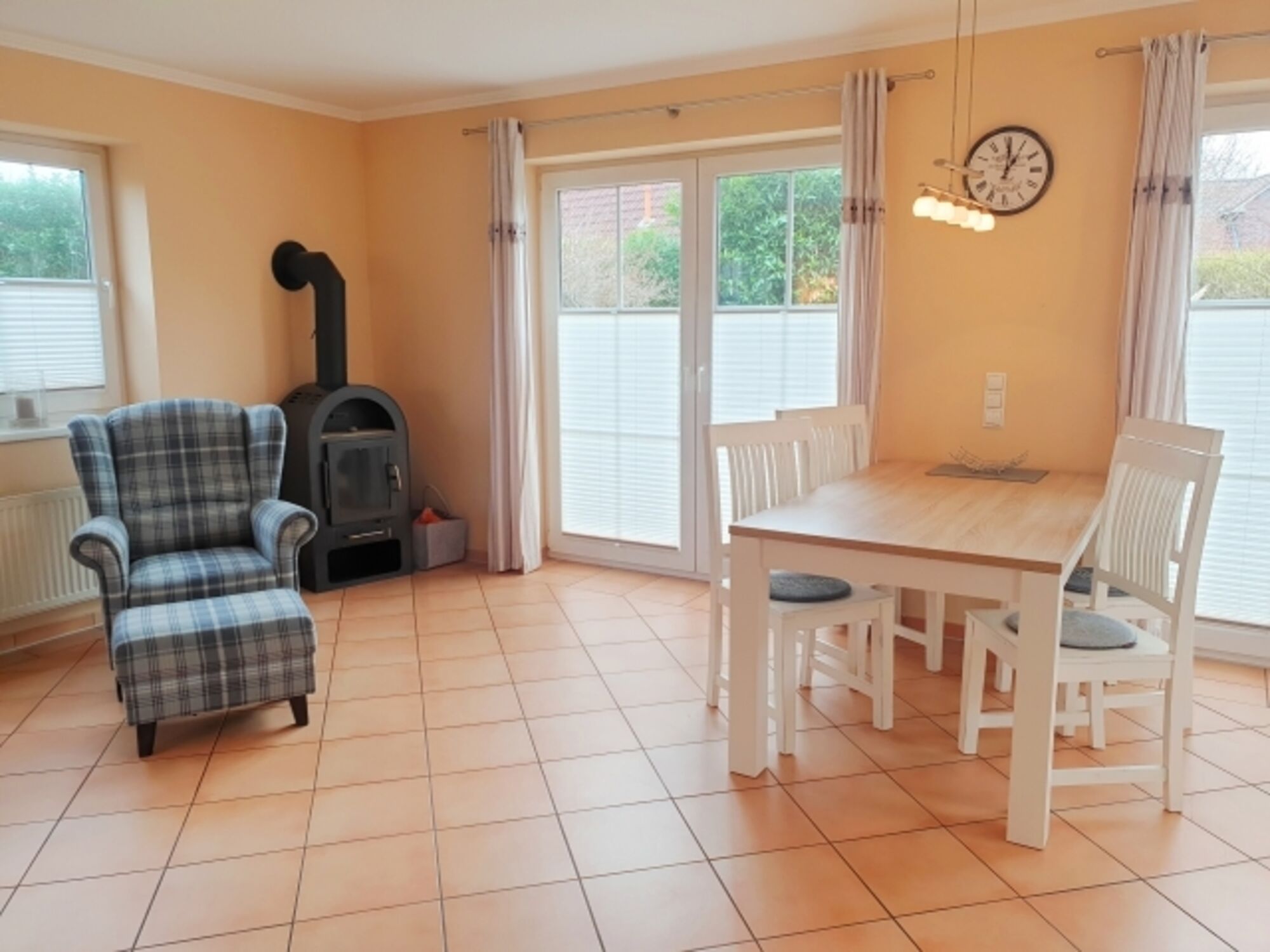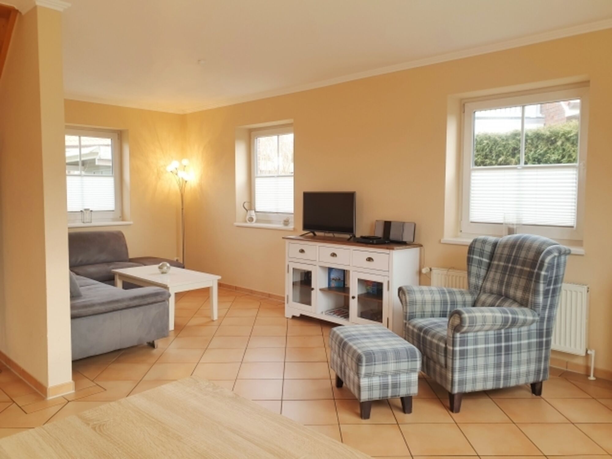 TV, TV-Sat, TV-Flachbildschirm, HDTV Flachbildschirm, CD-Player, Bücher, Kaminofen, Eckcouch, Sessel
