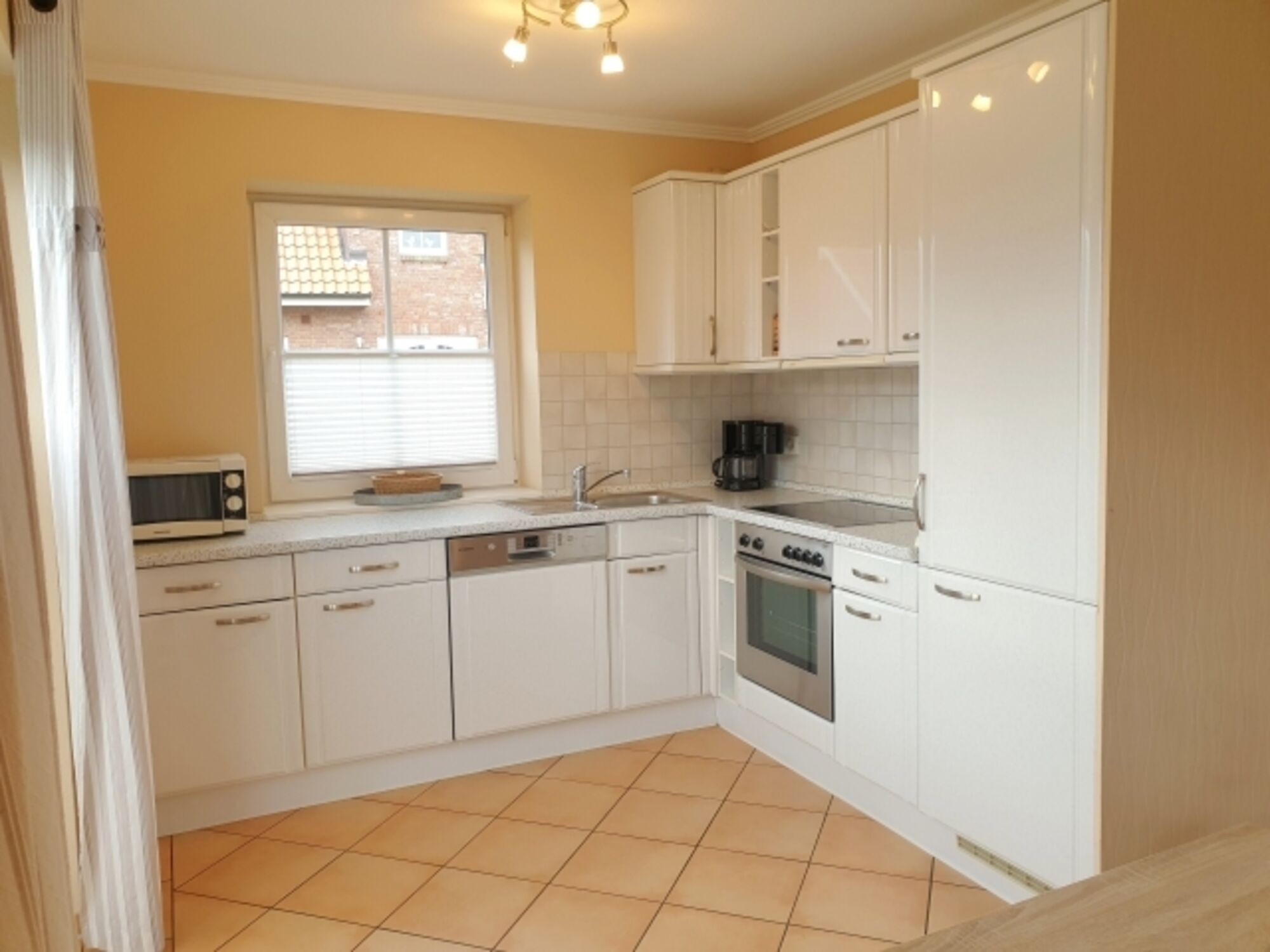 Cerankochfeld, Dunstabzugshaube, Kühlschrank mit Gefrierfach, Gefrierschrank, Korkenzieher / Flaschenöffner, Essplatz in der Küche