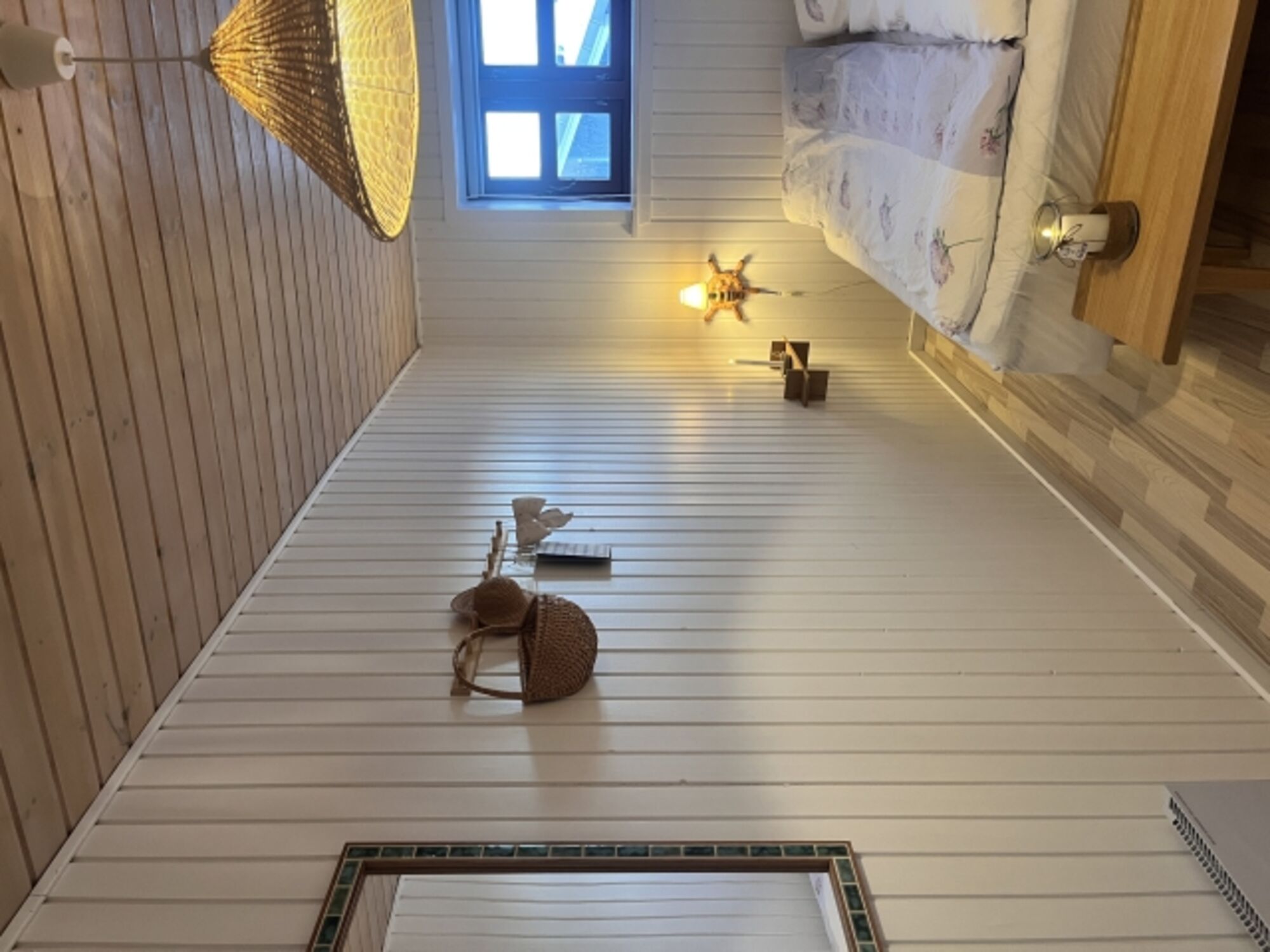 Unteretage: Neues Badezimmer mit Whirlpool und ein Schlafzimmer mit ein Dobbeltbett.