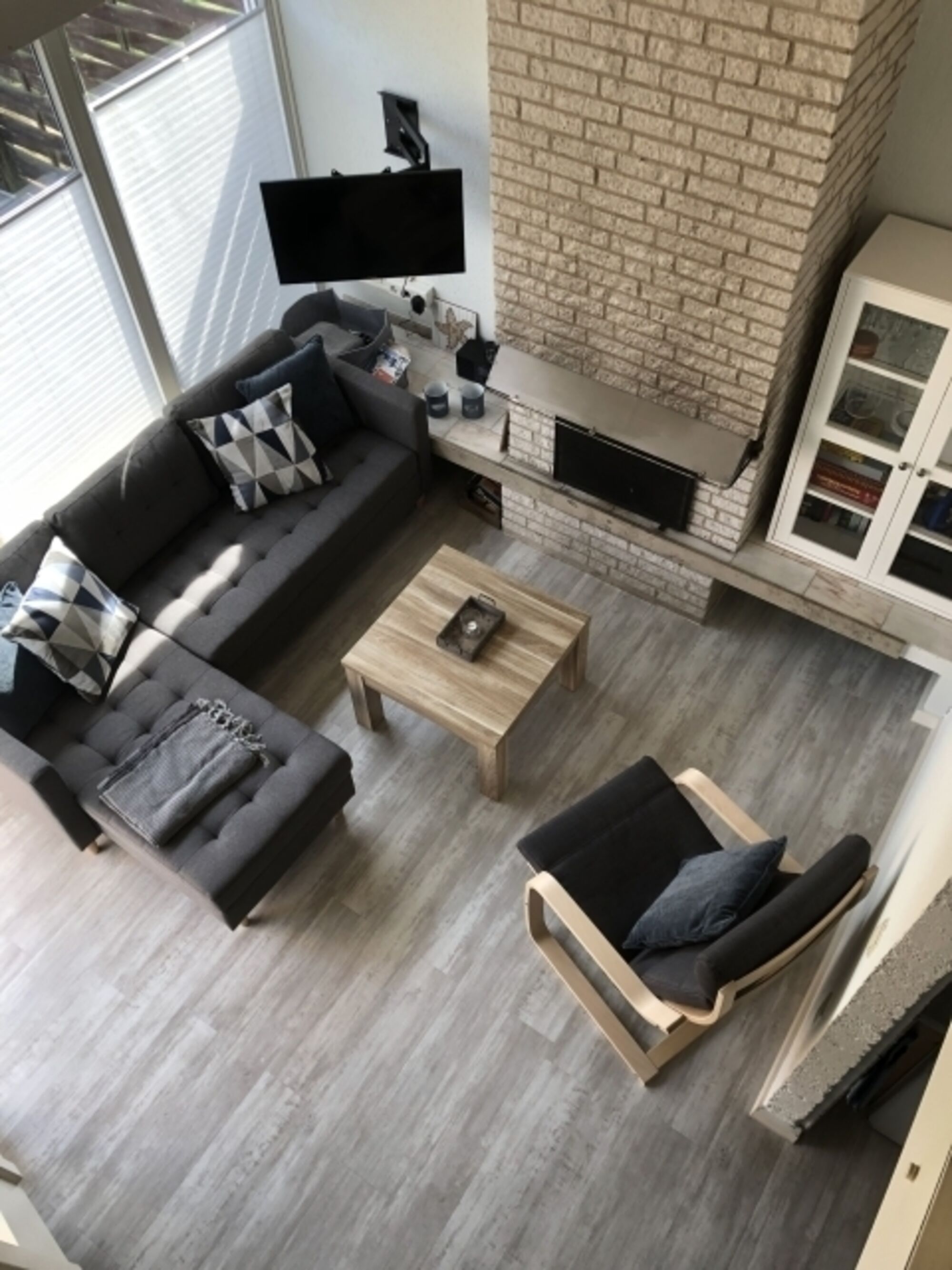 TV, TV-Kabel, TV-Flachbildschirm, Hi-Fi-Anlage mit Bluetooth, Bücher, Offener Kamin, Eckcouch
