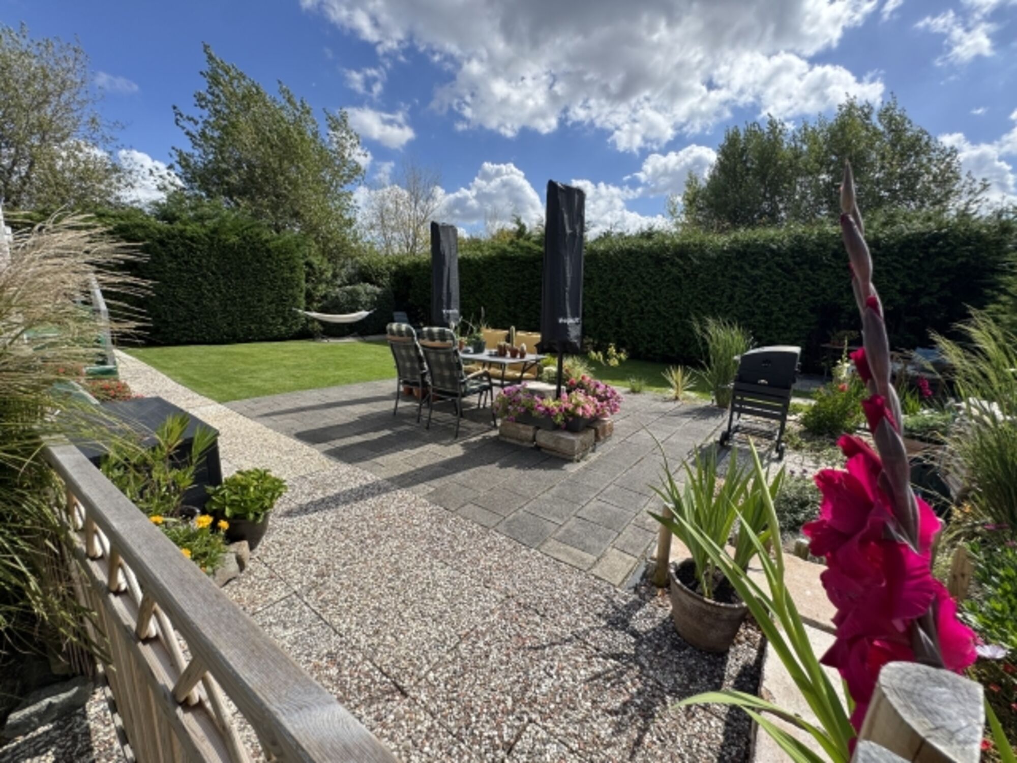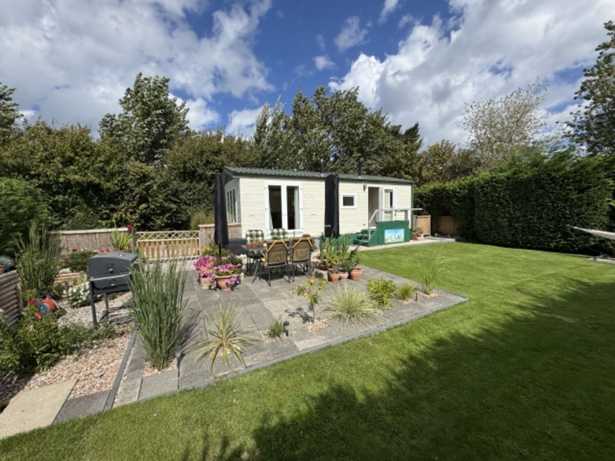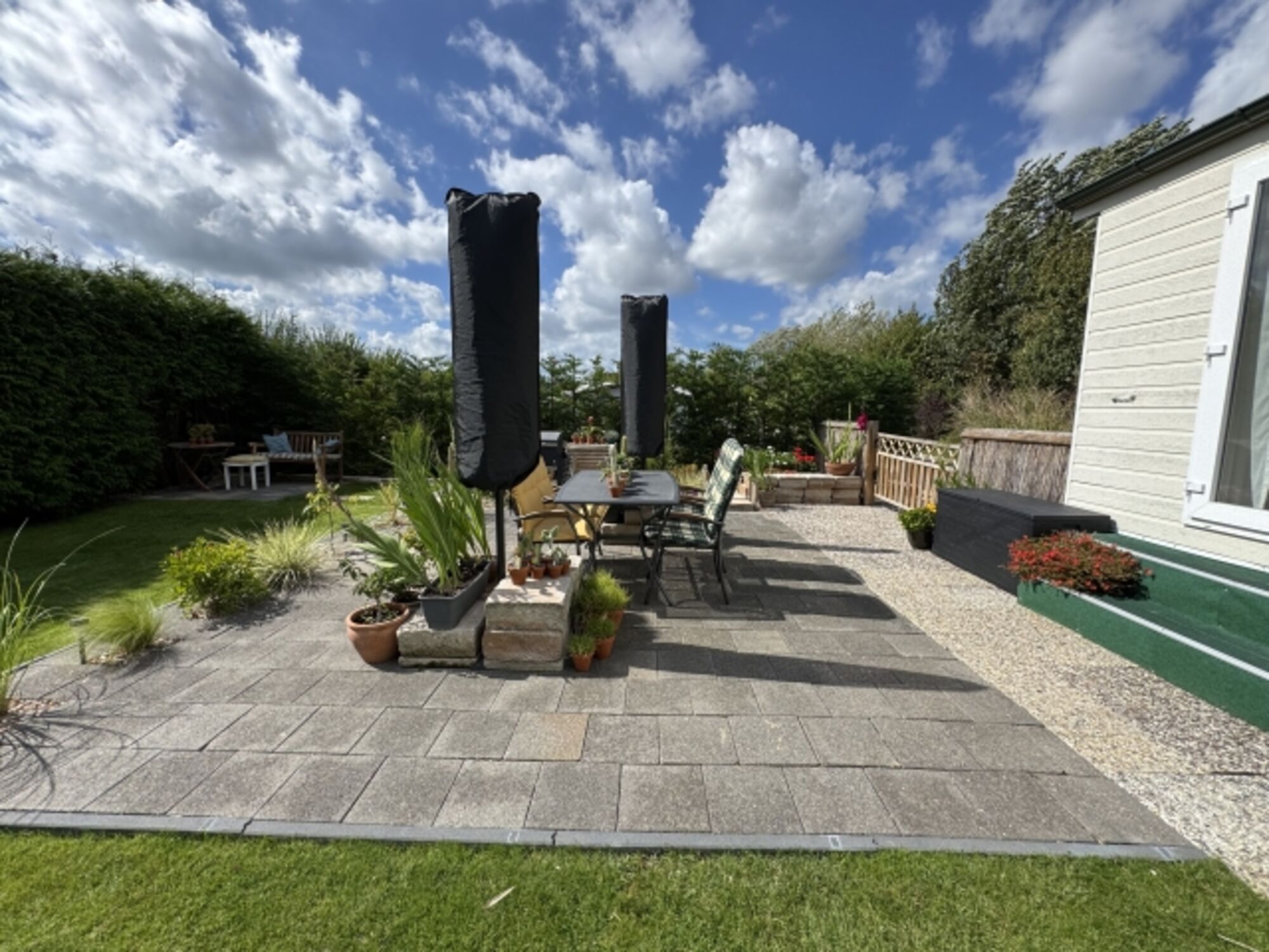 Der großzügige Garten lädt zum Verweilen ein und ist mit bequemen Gartenmöbeln ausgestattet. Hier können Sie auf der Terrasse entspannen oder den Tag mit einem BBQ ausklingen lassen. Ein eigener Parkplatz steht Ihnen zur Verfügung, sodass Sie jederzeit Ausflüge in die umliegende Region unternehmen können.