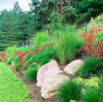 Feuerschale für gemütliche Stunden im Garten. Tolle Bepflanzung mit Gräsern zum Wald hin.
