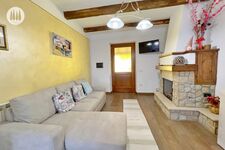 Man kommt ins Haus und ist im Wohnbereich mit Schlafcouch und Kamin.