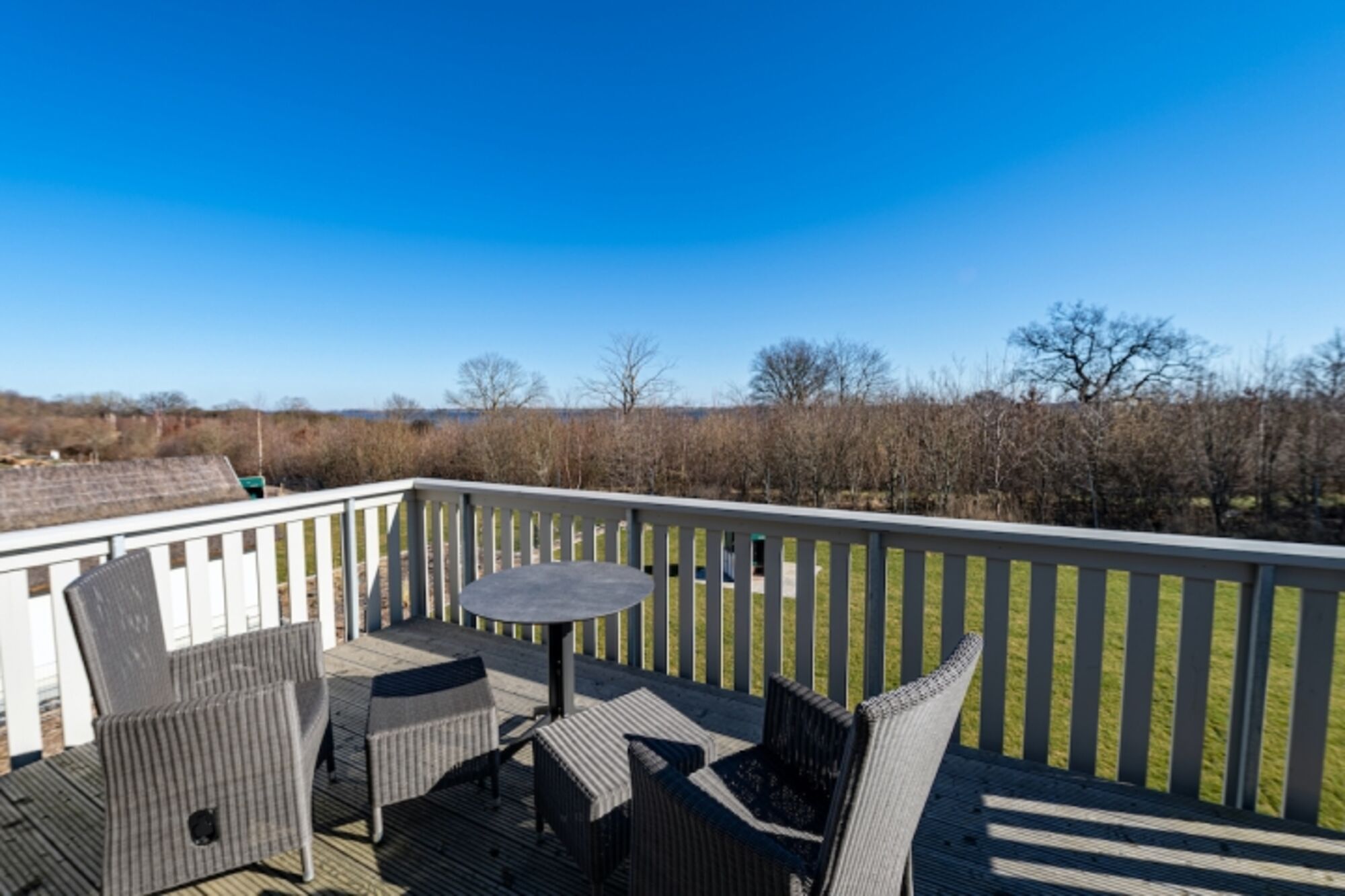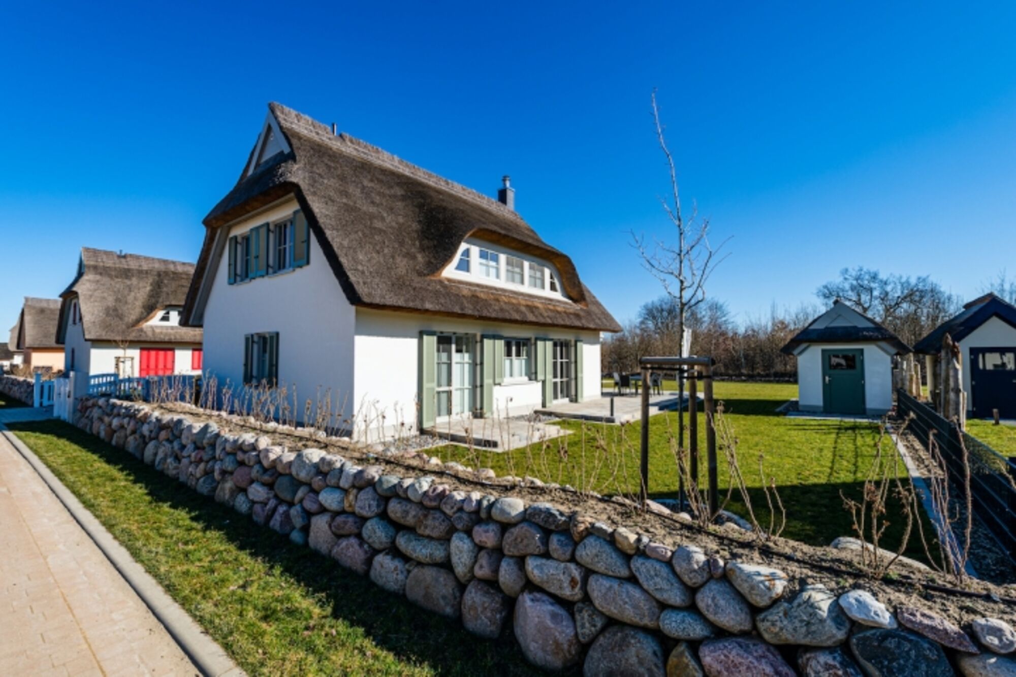 Luxus Reetdach-Ferienhaus am Strelasund. Erbaut 2020 mit Kamin, Sauna, schöner Außenterrasse, Dachterrasse, Gasgrill.