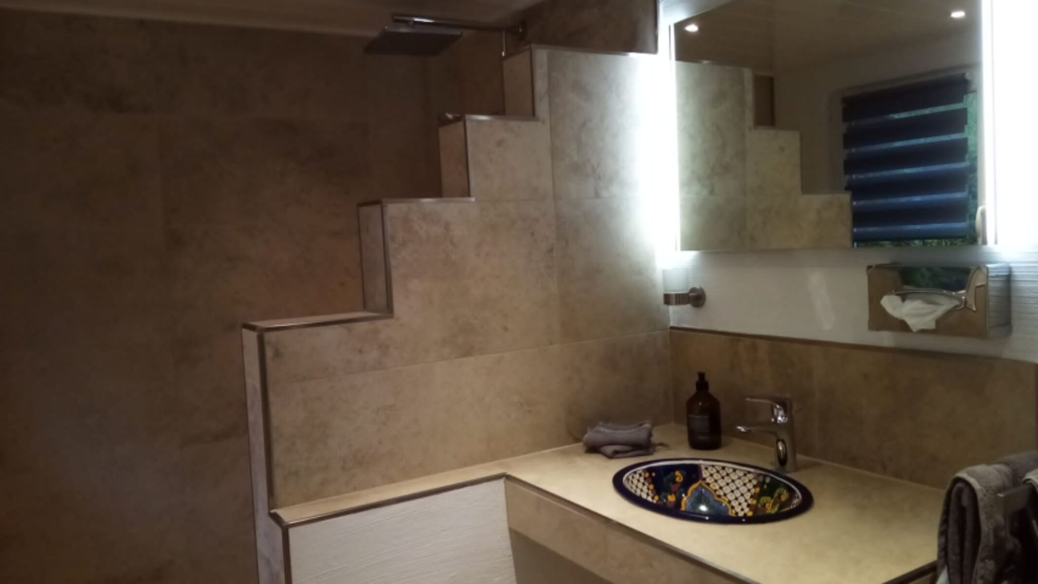 Waschbecken, Kosmetiktücher, Spiegel, Fenster im Bad