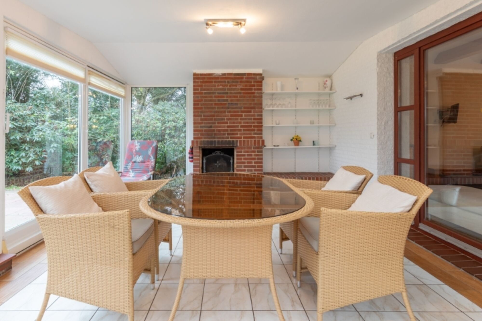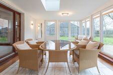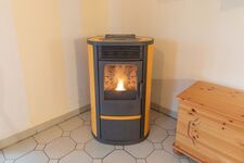 Im Erdgeschoss erwartet Sie ein lichtdurchfluteter Wintergarten mit gemütlichem Essbereich. Der Kaminofen sorgt für behagliche Wärme an kalten Tagen. Im Wohnraum können Sie es auf der bequemen Sofaecke beim Fernsehen relaxen. Dieser Bereich wird über einen Pelletofen erwärmt. Die offene Küche ist komplett ausgestattet: Herd, Backofen, Kühlschrank mit Gefrierfach, Geschirrspülmaschine, Kaffeemaschine, Toaster, Wasserkocher, Sitzecke, ausreichend Geschirr und Kochutensilien.