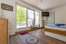 Vom Schlafzimmer im 1.OG gelangt man direkt auf die große 25 m² Dachterrasse mit Terrassenmöbeln und einem eigenen Strandkorb mit Meerblick (30m!)