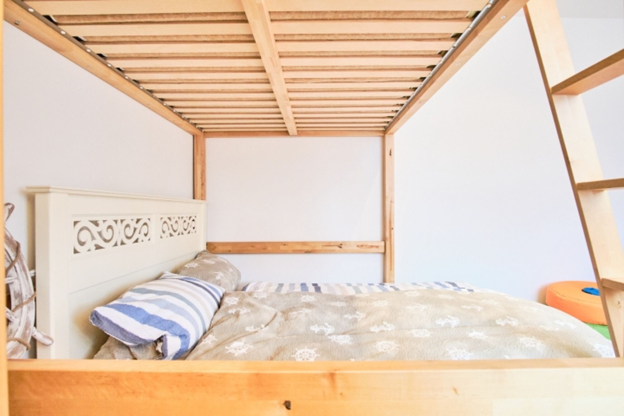 2 Schlafräume: 1 Schlafraum mit 1 Doppelbett, 1 Schlafraum mit 1 Doppelhochbett (140 x 200 cm) und 1 Wasserbett (140 x 200 cm) (Fußböden: Fliesen mit Fußbodenheizung)
