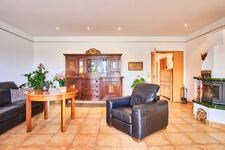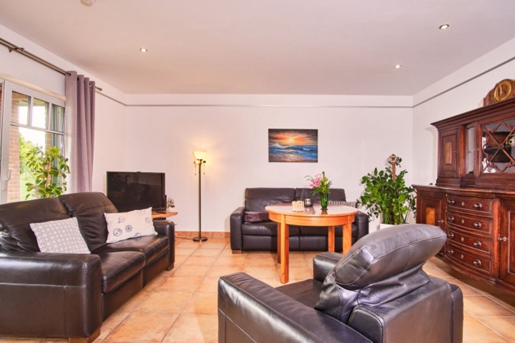 1 Wohnzimmer: Kamin, 2m langes Ledersofa, elektrischer Relaxsessel und 1 Scherenstuhl (Fußboden: Fliesen mit Fußbodenheizung)