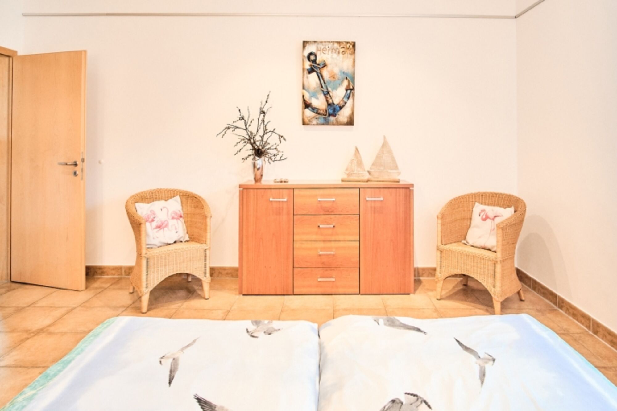 1 Schlafraum mit 1 Doppelbett (Fußböden: Fliesen mit Fußbodenheizung) Doppelbett 1,80 x 2,00m, Kommode, Leselampe am Bett
