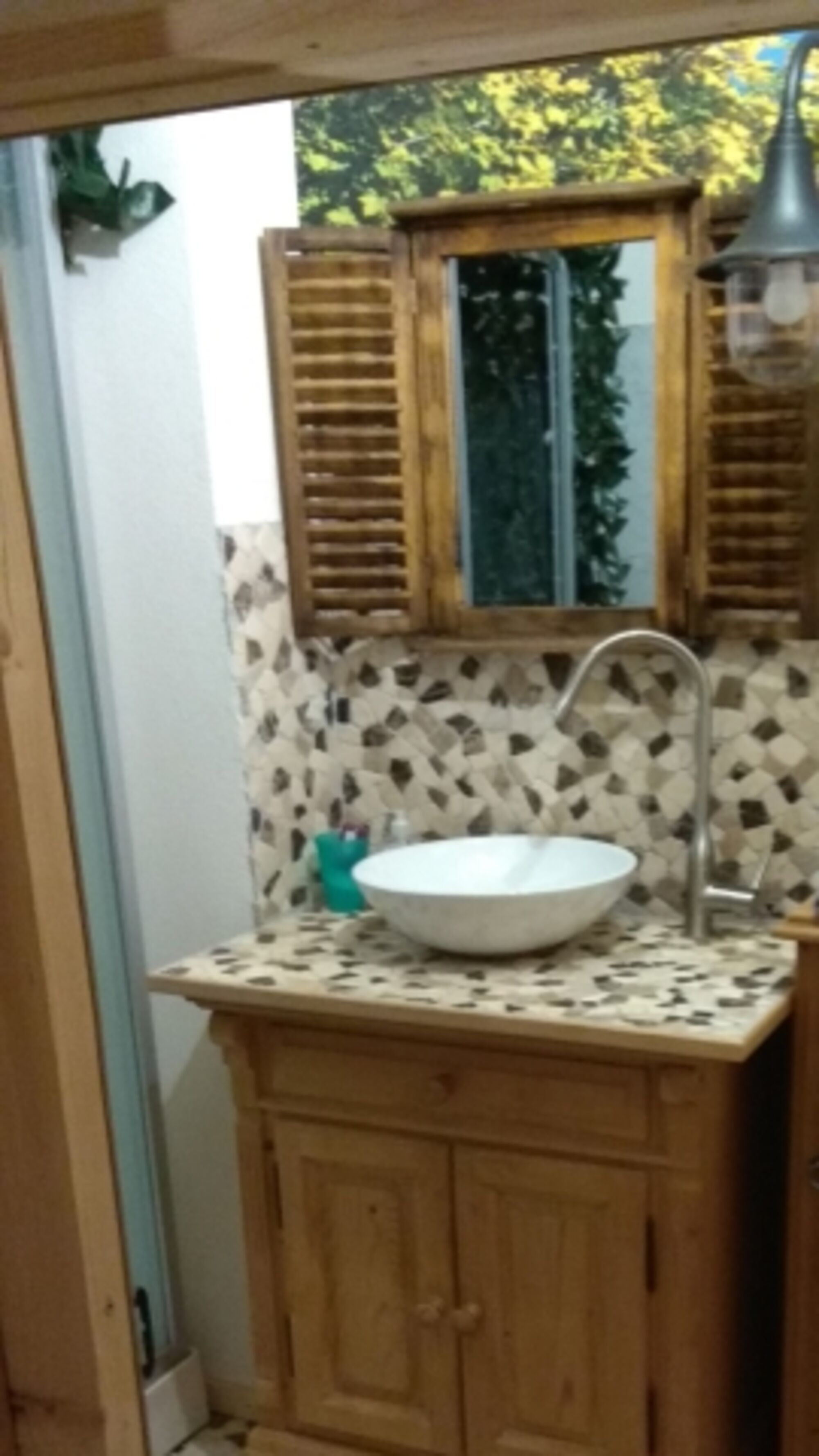 Cerankochfeld, Dunstabzugshaube, Kühlschrank mit Gefrierfach, Korkenzieher / Flaschenöffner, Gewürze (Salz, Pfeffer, Zucker), Geschirrhandtücher, Essplatz in der Küche
