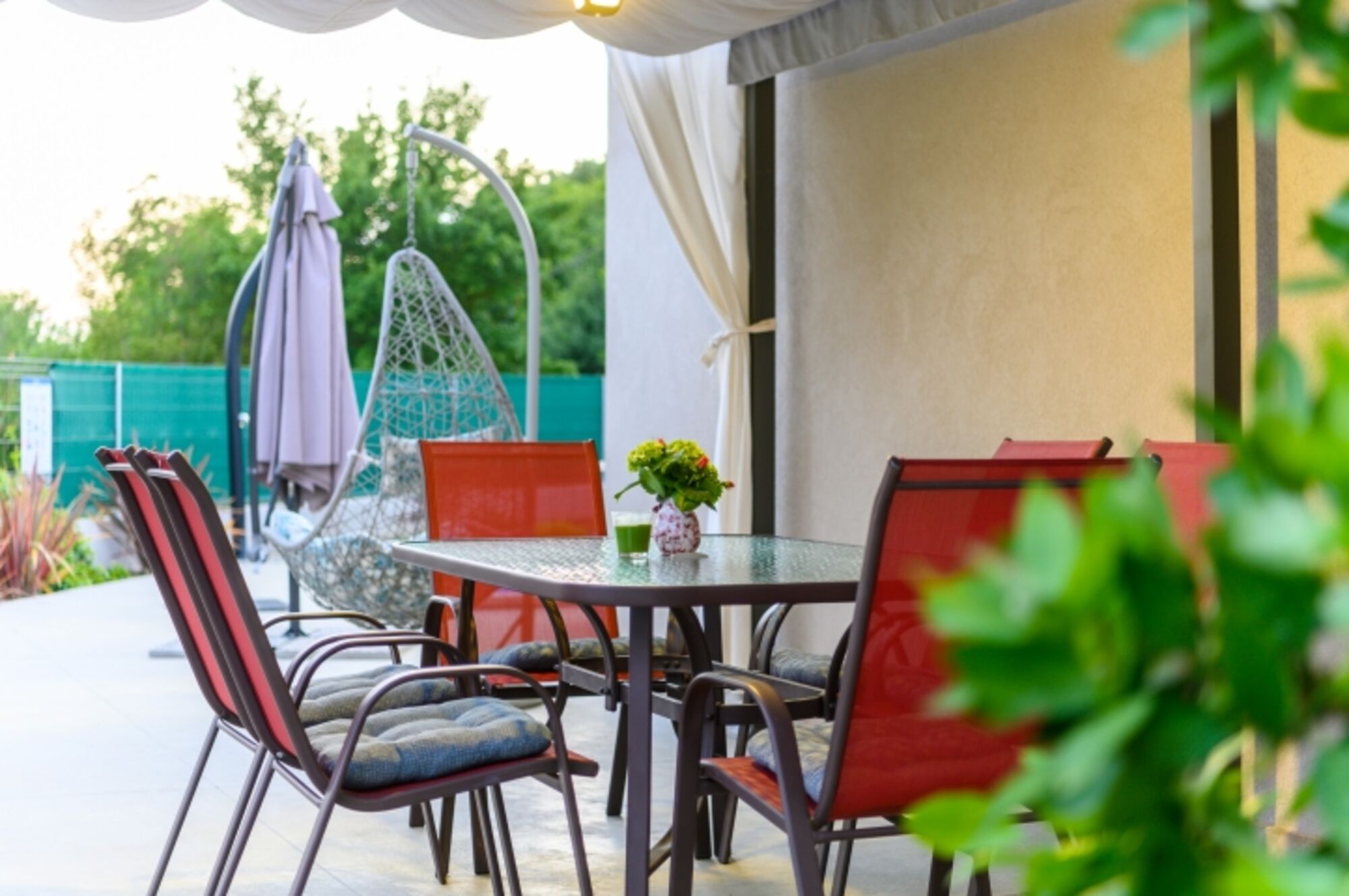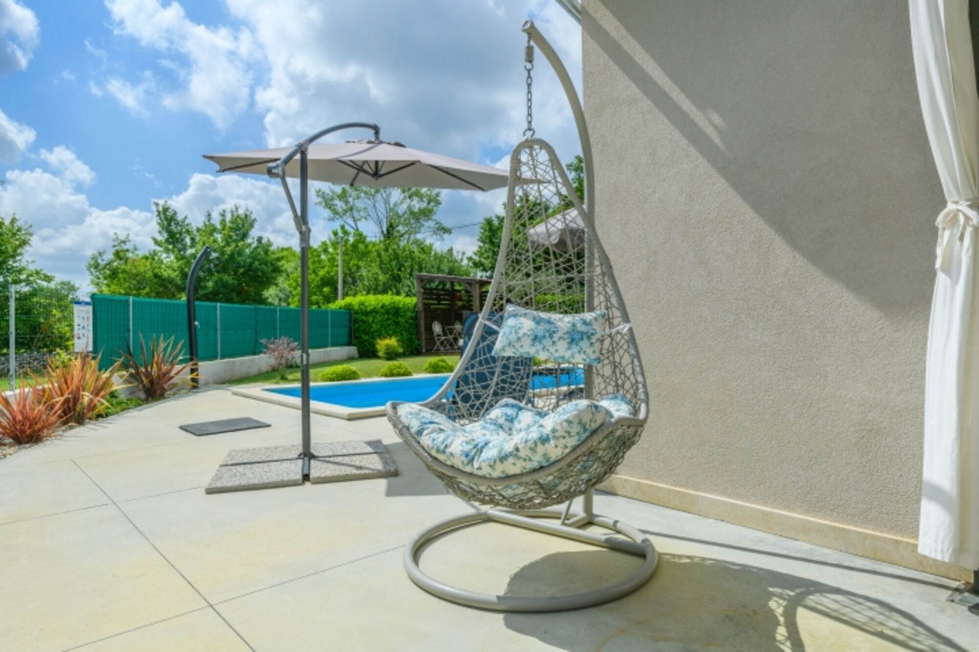 Der geräumige, eingezäunte Garten mit privatem Pool, überdachter Terrasse und Grill bietet den perfekten Ort für Familienmomente und Entspannung an der frischen Luft.