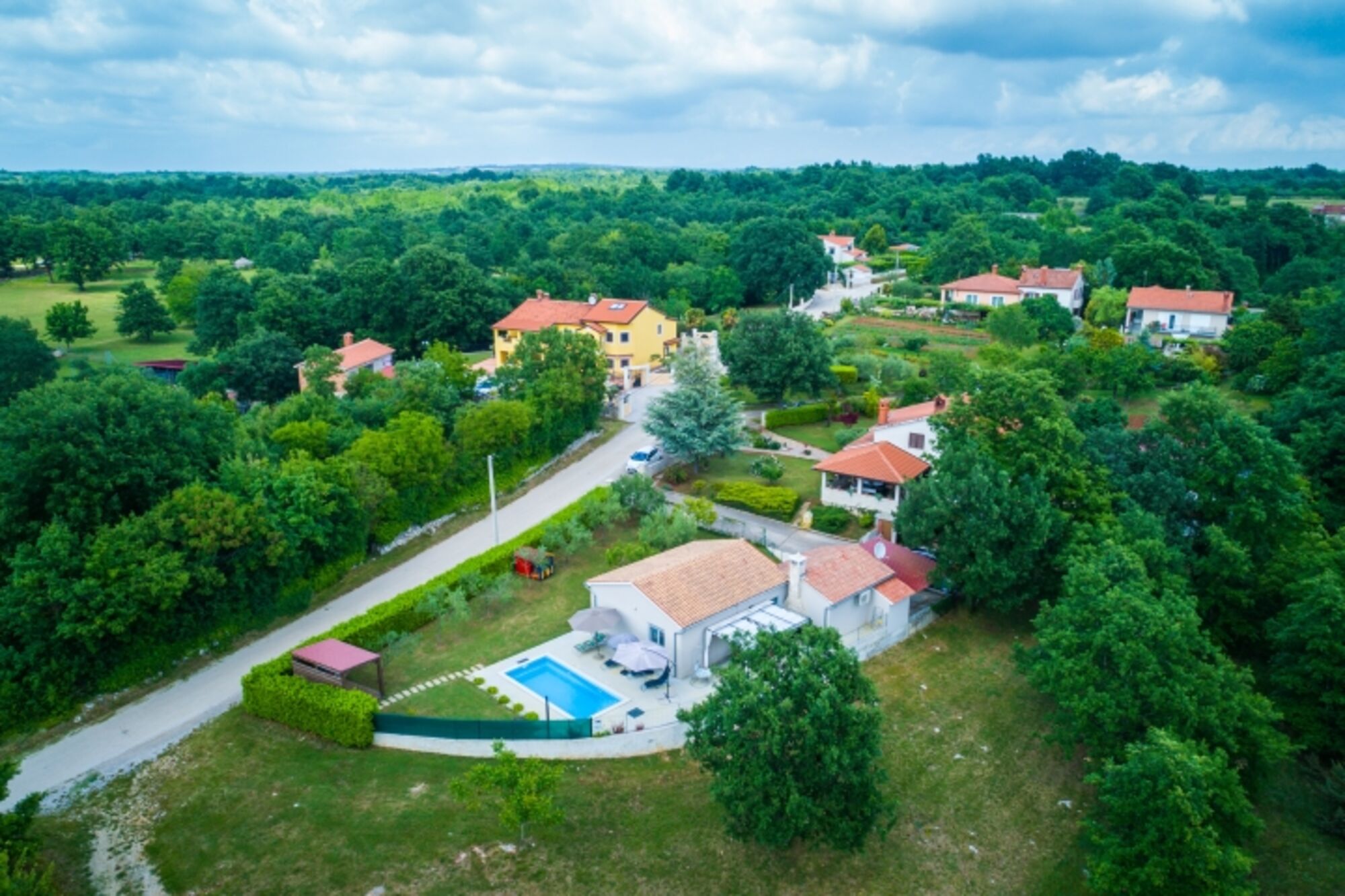 Ferienhaus mit Pool und umgeben von viel Grün