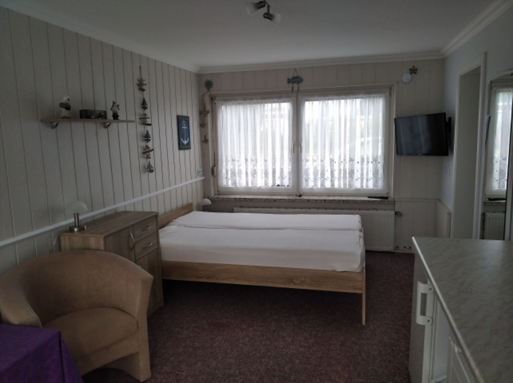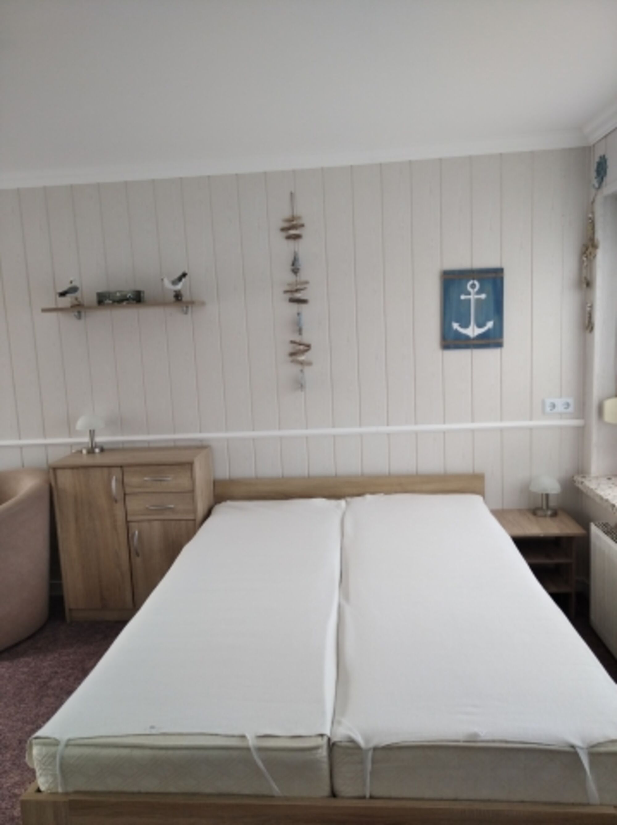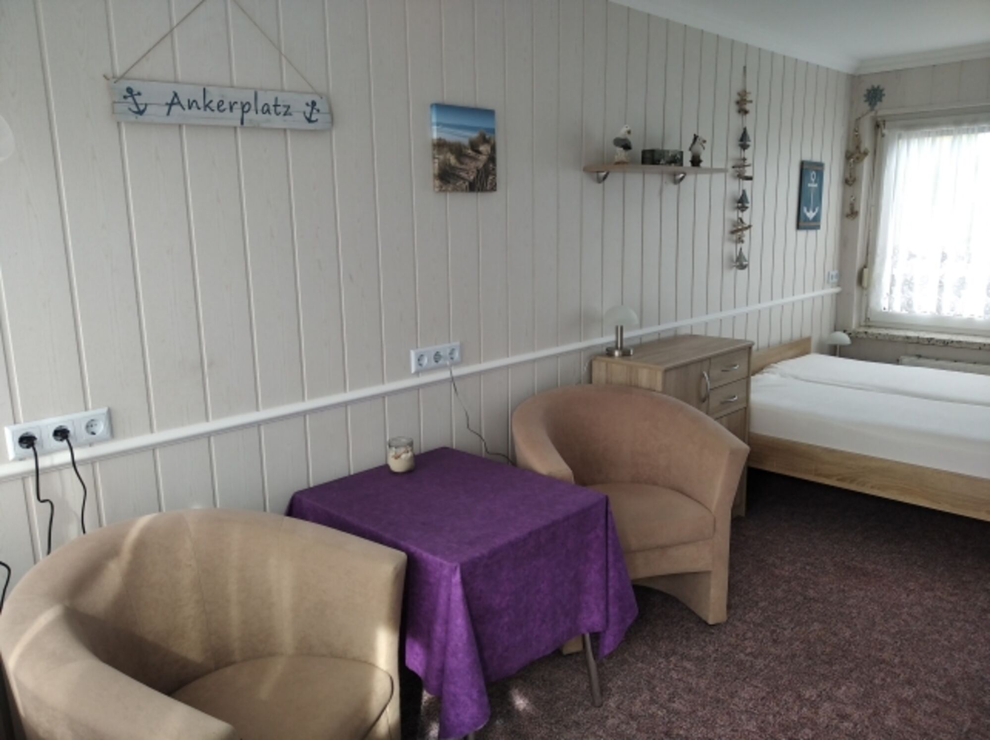Einem Doppelbett ,einem Tisch und 2 Sessel .