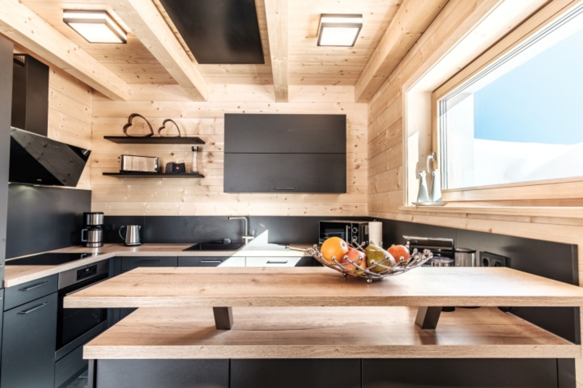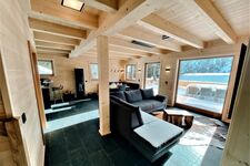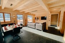 Das Wohnzimmer mit der offenen Küche und Theke lädt zum Verweilen ein. Während die Kinder nach einem aufregendem Skitag Netflix schauen, kochen Sie gemütlich in der Küche und lassen dabei den Blick über das Kaminfeuer und die Gipfel streifen. Alle Schlafzimmer verfügen ebenfalls über Sitzgelegenheiten und Sat-/Smart-TVs sowie 2 über einen Balkon. Auf der großen Süd-Panoramaterrasse finden Sie alles, was Sie für den perfekten Urlaub in den Bergen brauchen – Außenkamingrill, HotPot und Gartenmöbel. Alle Extras vom WLAN bis hin Waschmaschine sind selbstverständlich inkludiert.