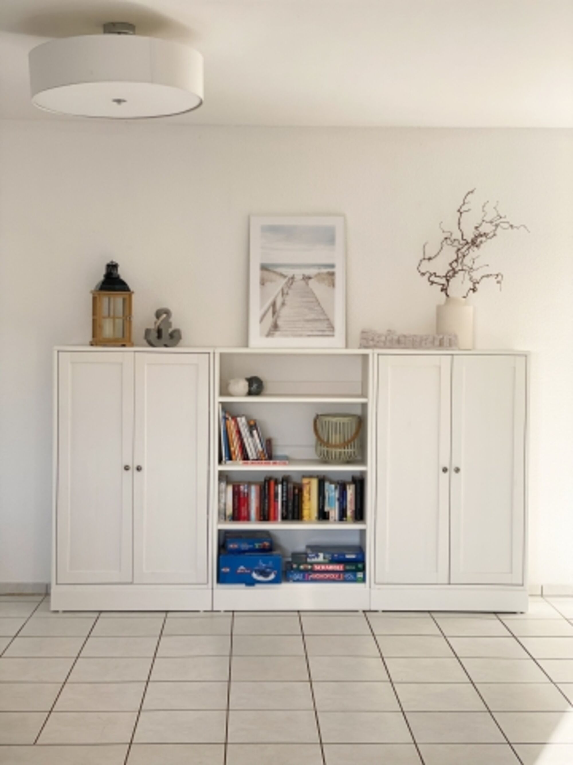 TV, TV-Kabel, HDTV Flachbildschirm, DVD-Player, DVD bzw. Blu-Ray-Filme, CD-Player, CD´s, Bücher, 2er-Sofa