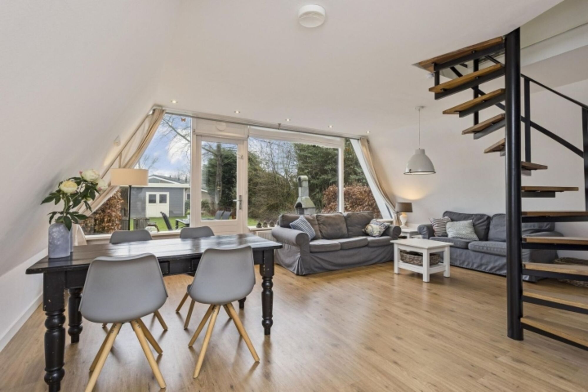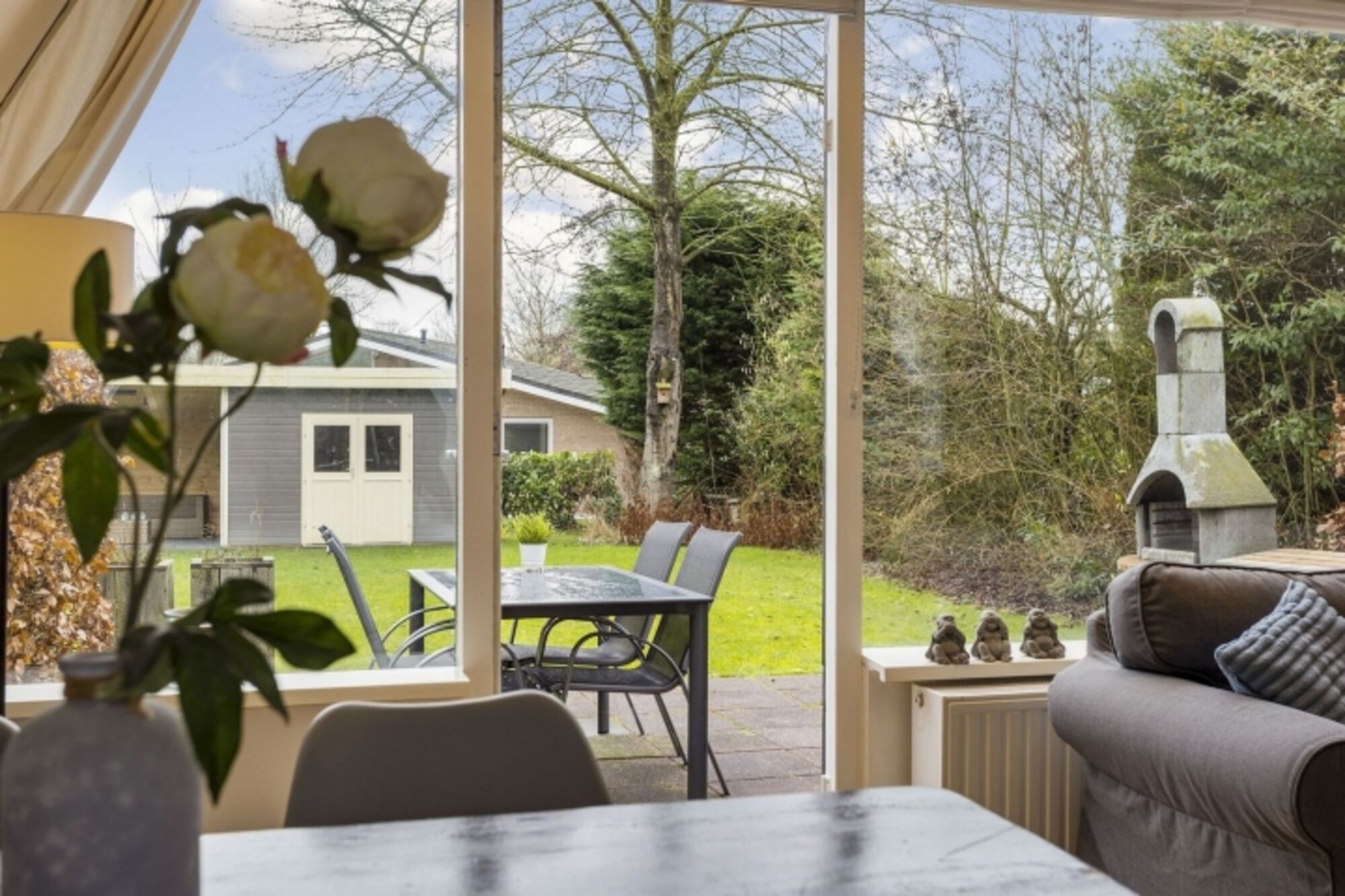 Der großzügige Garten hat eine große Rasenfläche, Terrassen und eine Überdachung mit Lounge-Set. Das Ganze ist mit Pflanzen und Zäunen eingezäunt, so dass es viel Privatsphäre gibt.