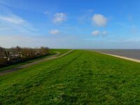 Auf dem Deich wächst sattes grünes Gras und manchmal kann man den Schäfchen beim Grasen zusehen. Hier ist kein Sandstrand sondern wie in Huisduinen bei Den Helder eine Deichbefestigung.