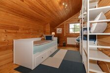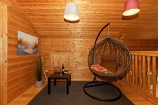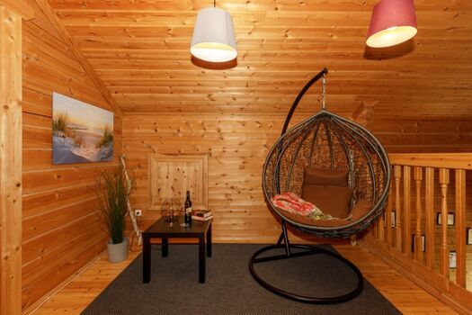 Im 1.OG gibt es zwei weitere Schlafzimmer mit Doppelbett, sowie eine Toilette und eine offene Galerie mit Hängesessel zum Relaxen.