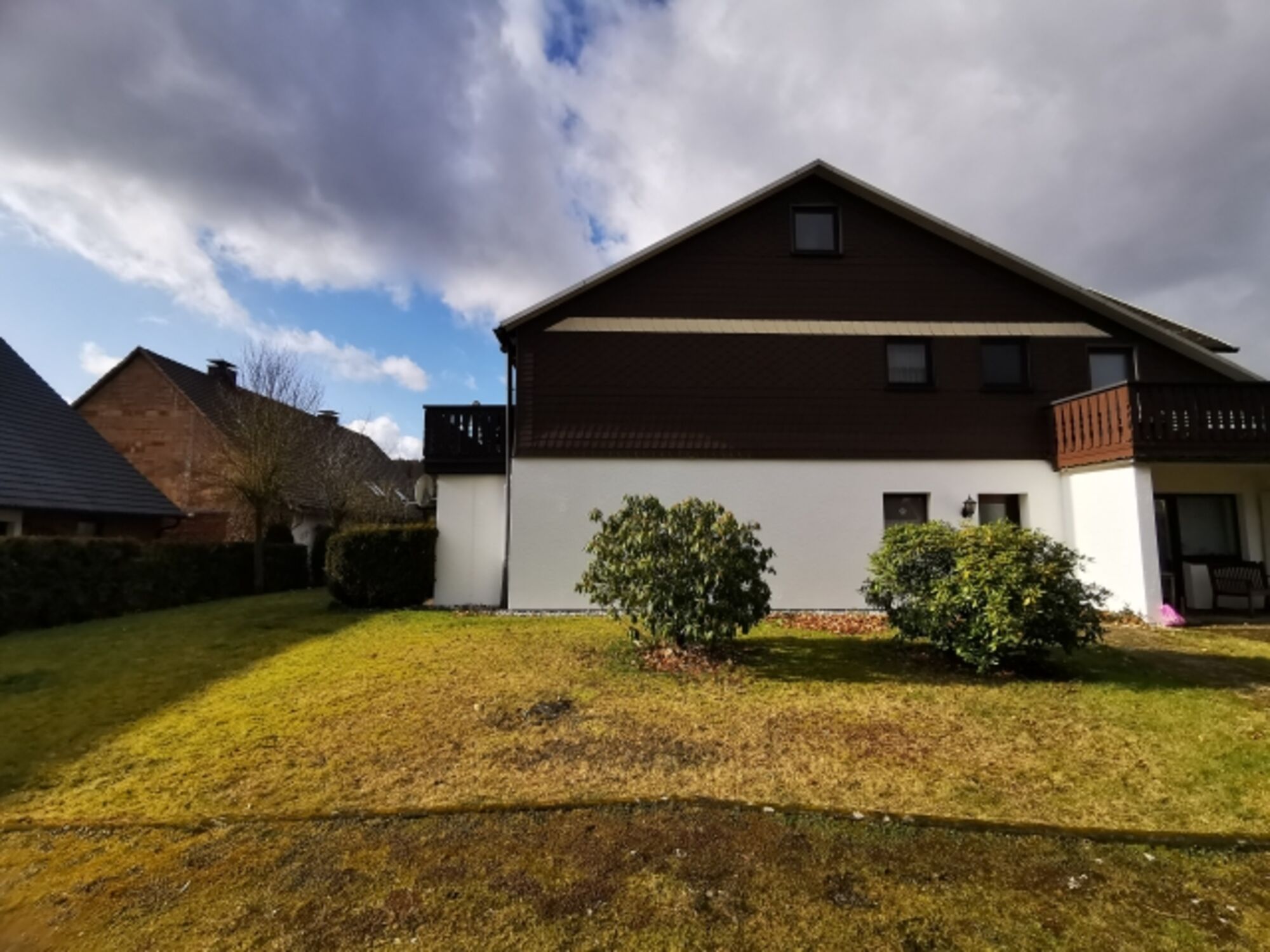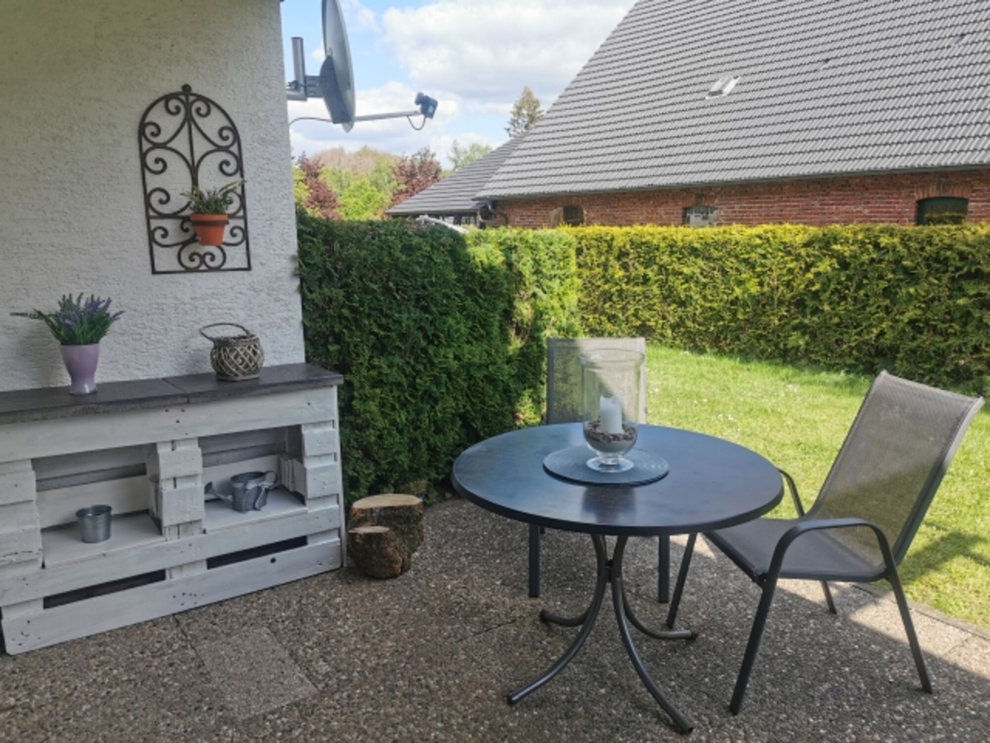 An der Terrasse grenzt die Gemeinschaftswiese. Kein direkter Autoverkehr - bis auf die Gäste, die ggf mal auf den Parkplatz fahren. Der Hund hat hier genügend Auslauf