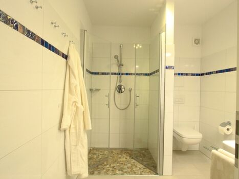 Im Bad gibt es eine geräumige bodengleiche Dusche, zusätzlich eine Gästetoilette.
