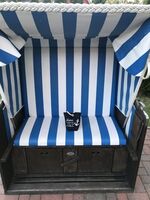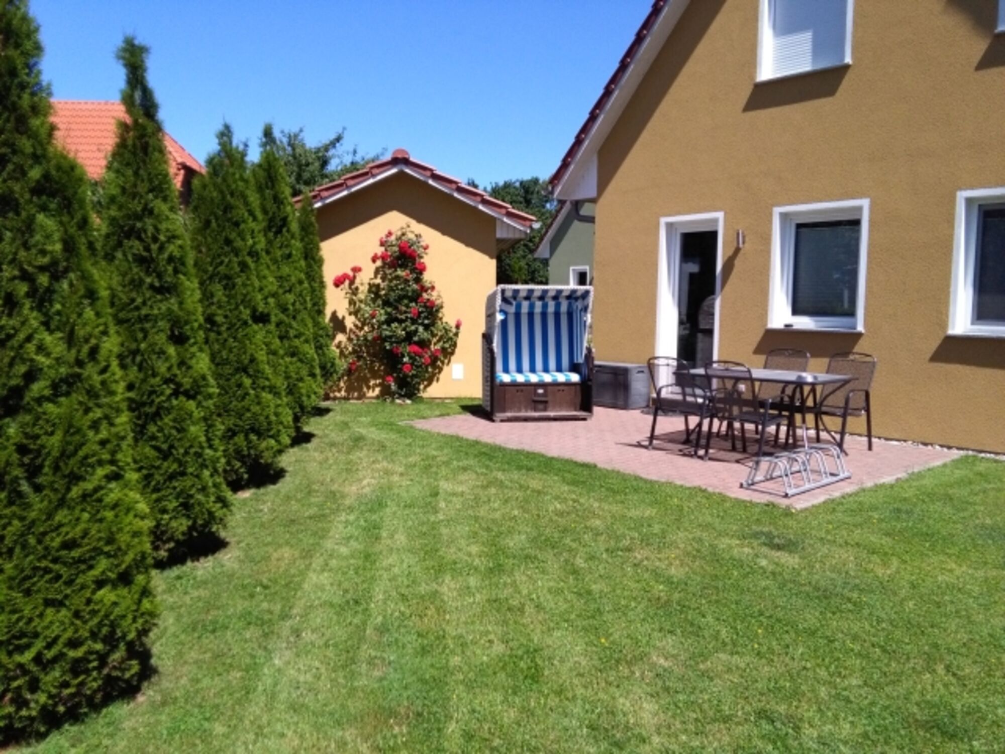 Zur Terrasse u. dem umzäunten Garten gehört auch ein Strandkorb.