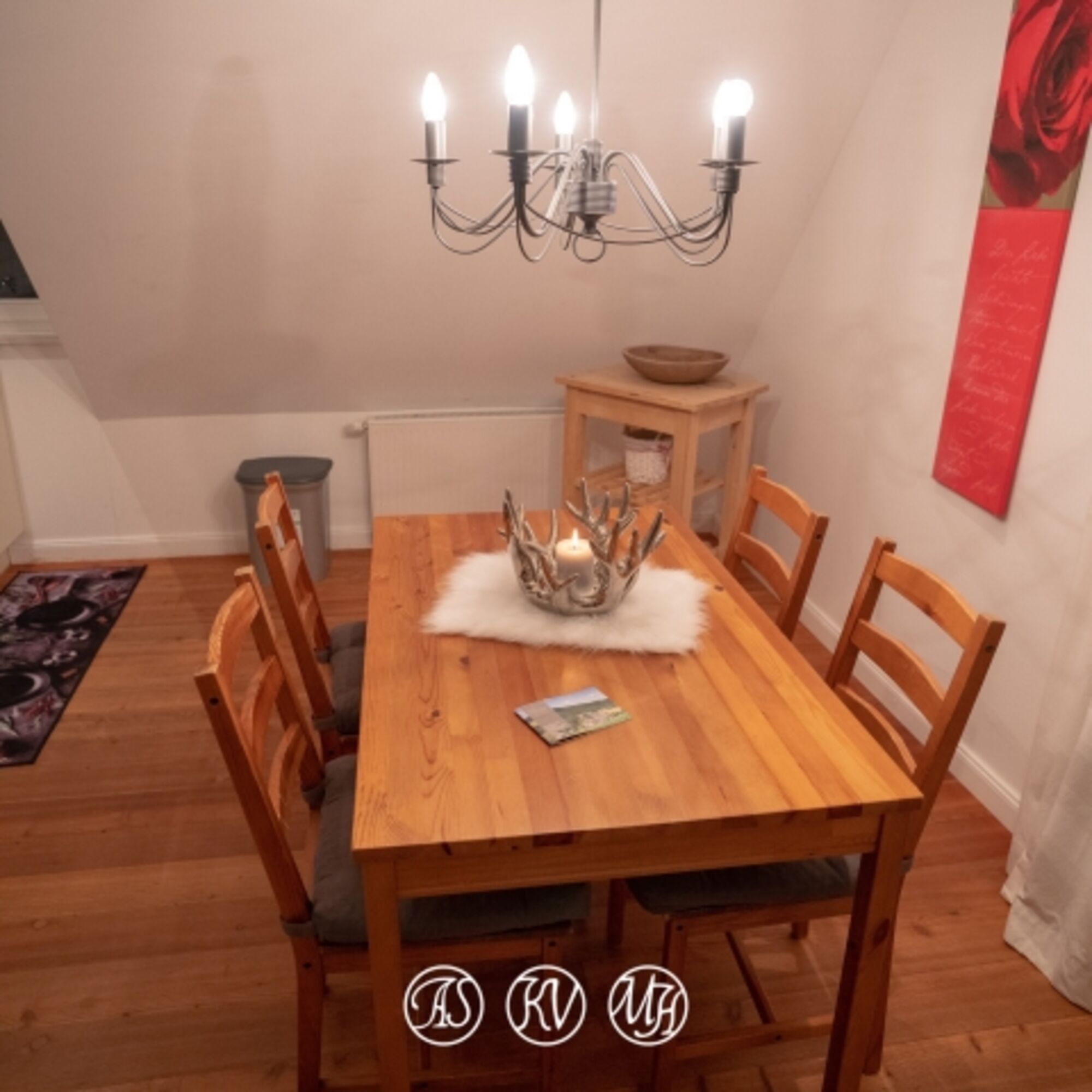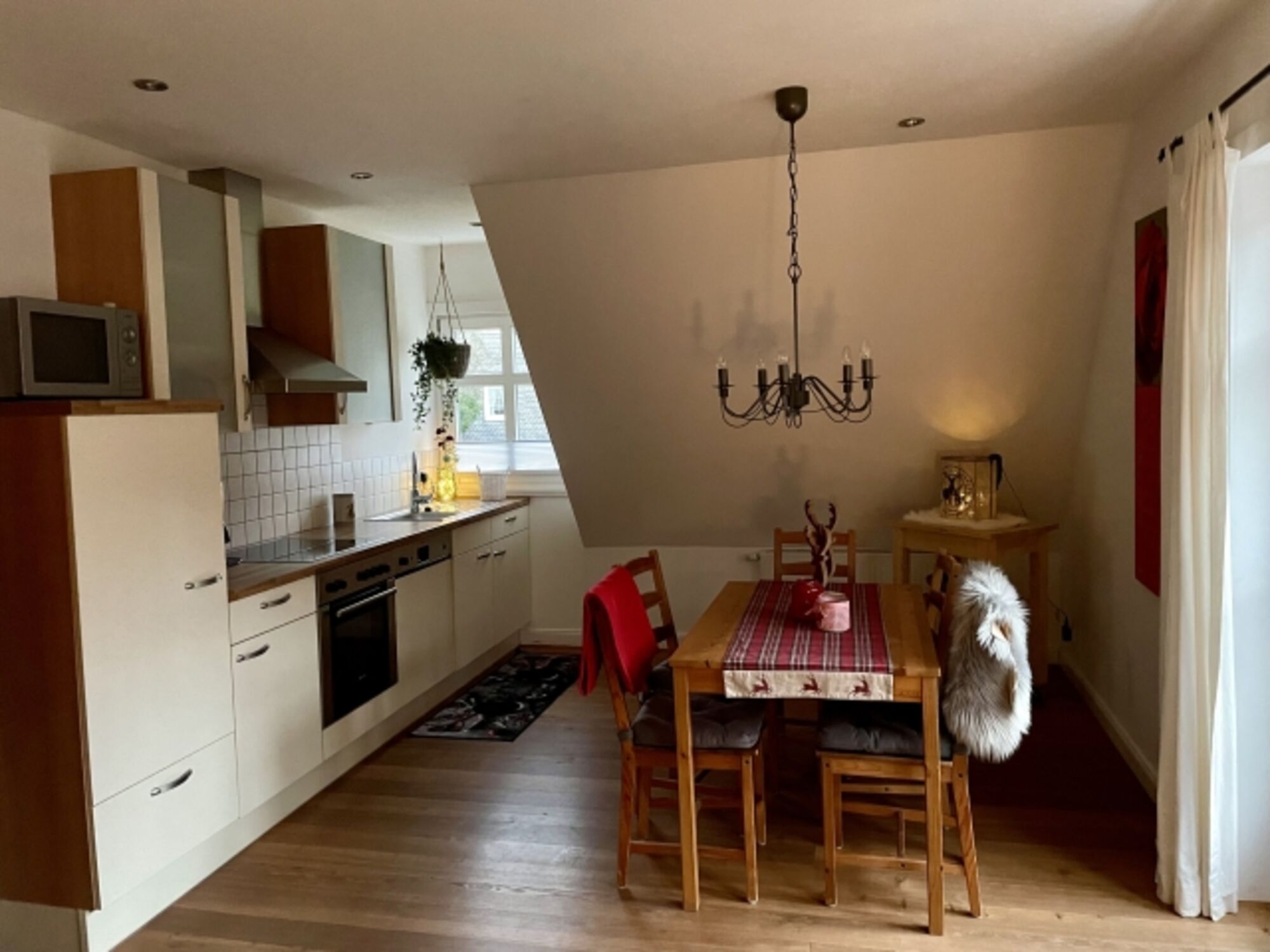 Cerankochfeld, Dunstabzugshaube, Kühlschrank mit Gefrierfach, Gewürze (Salz, Pfeffer, Zucker), Geschirrhandtücher, Mülltüten, Essplatz in der Küche