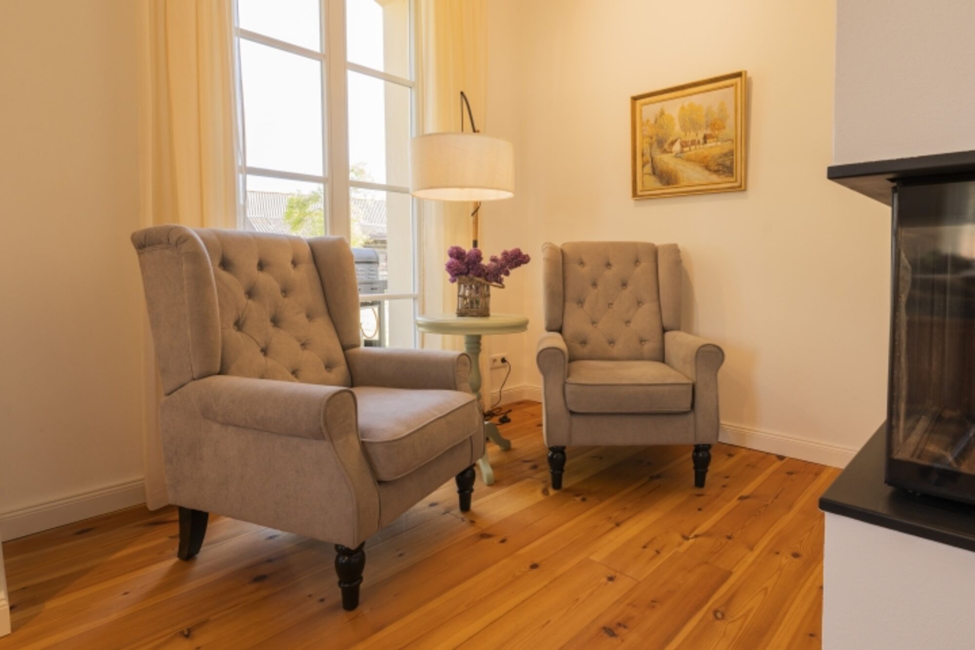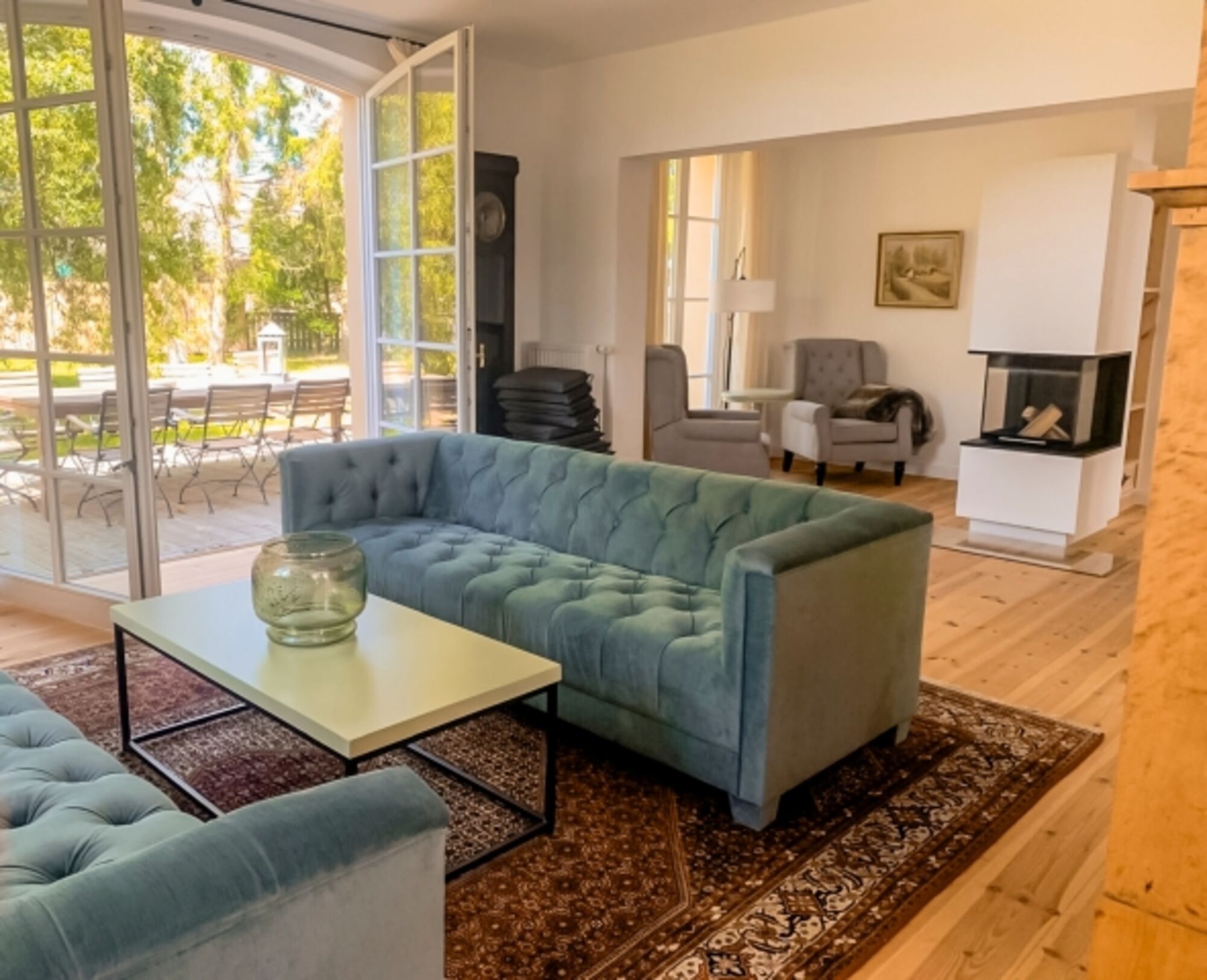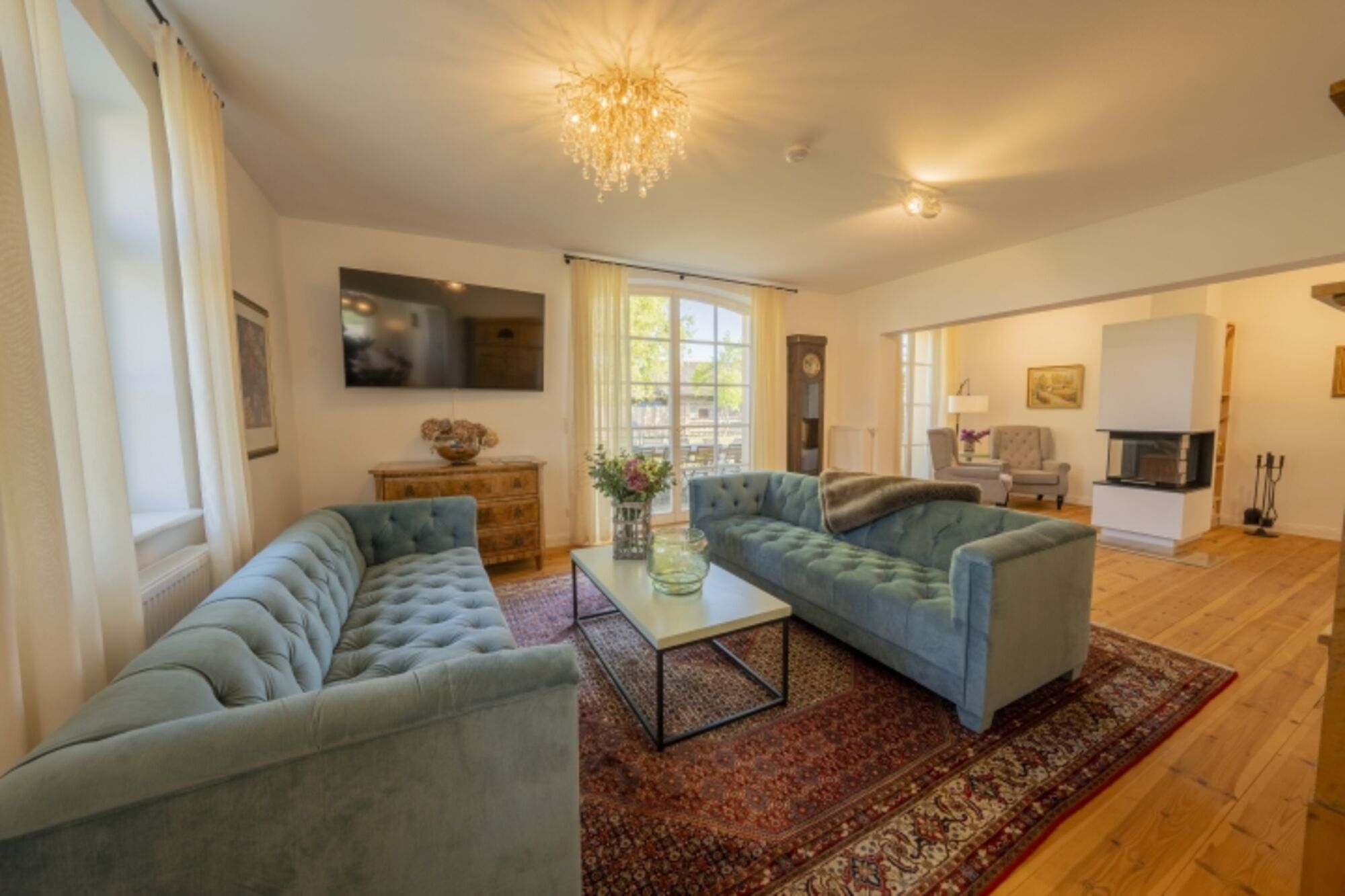 – Großes, lichtdurchflutetes Wohnzimmer mit Kamin für gemütliche Abende