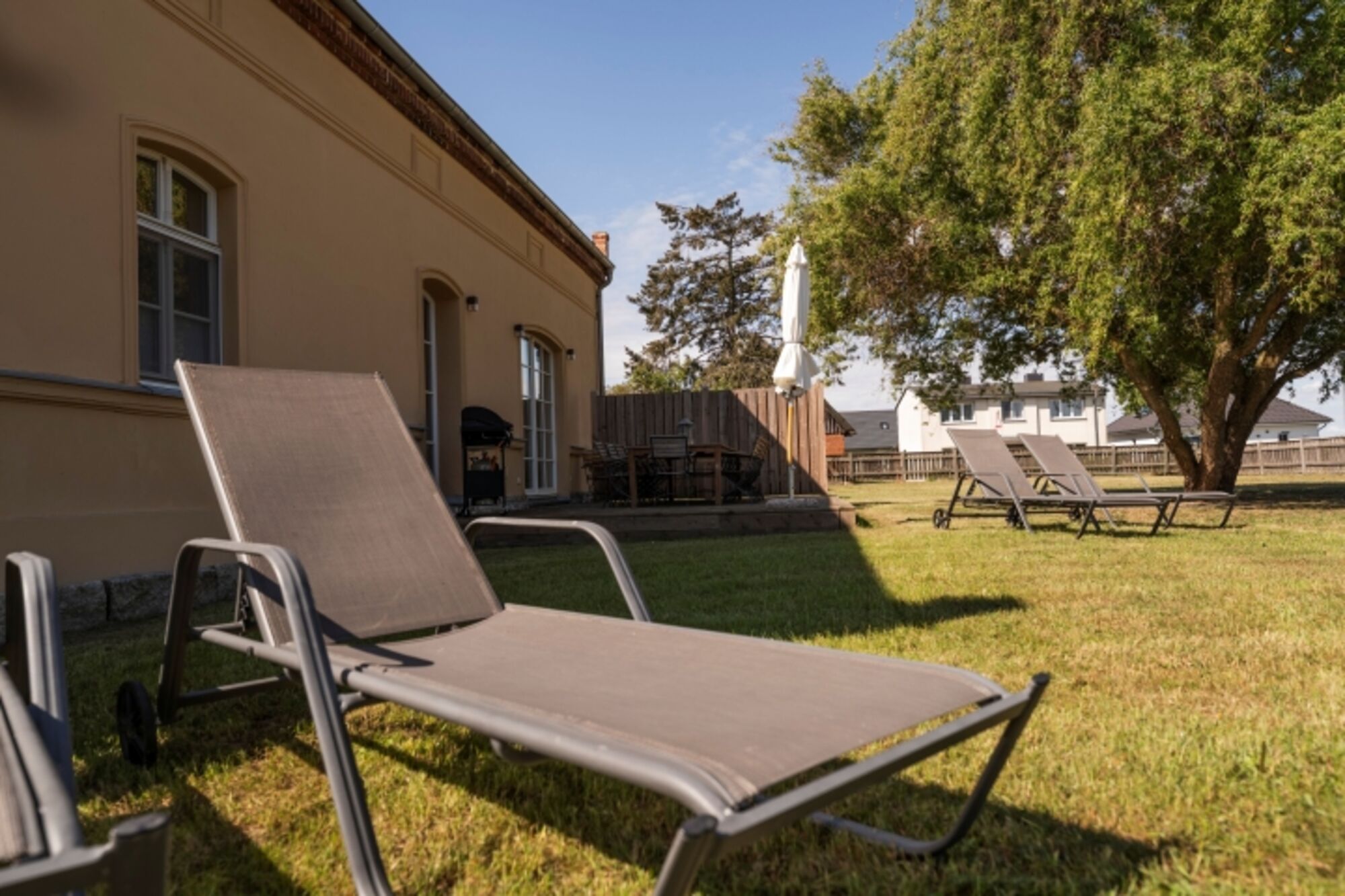 – Eigene Terrasse mit Gartenmöbeln, Sonnenschirm und Gasgrill