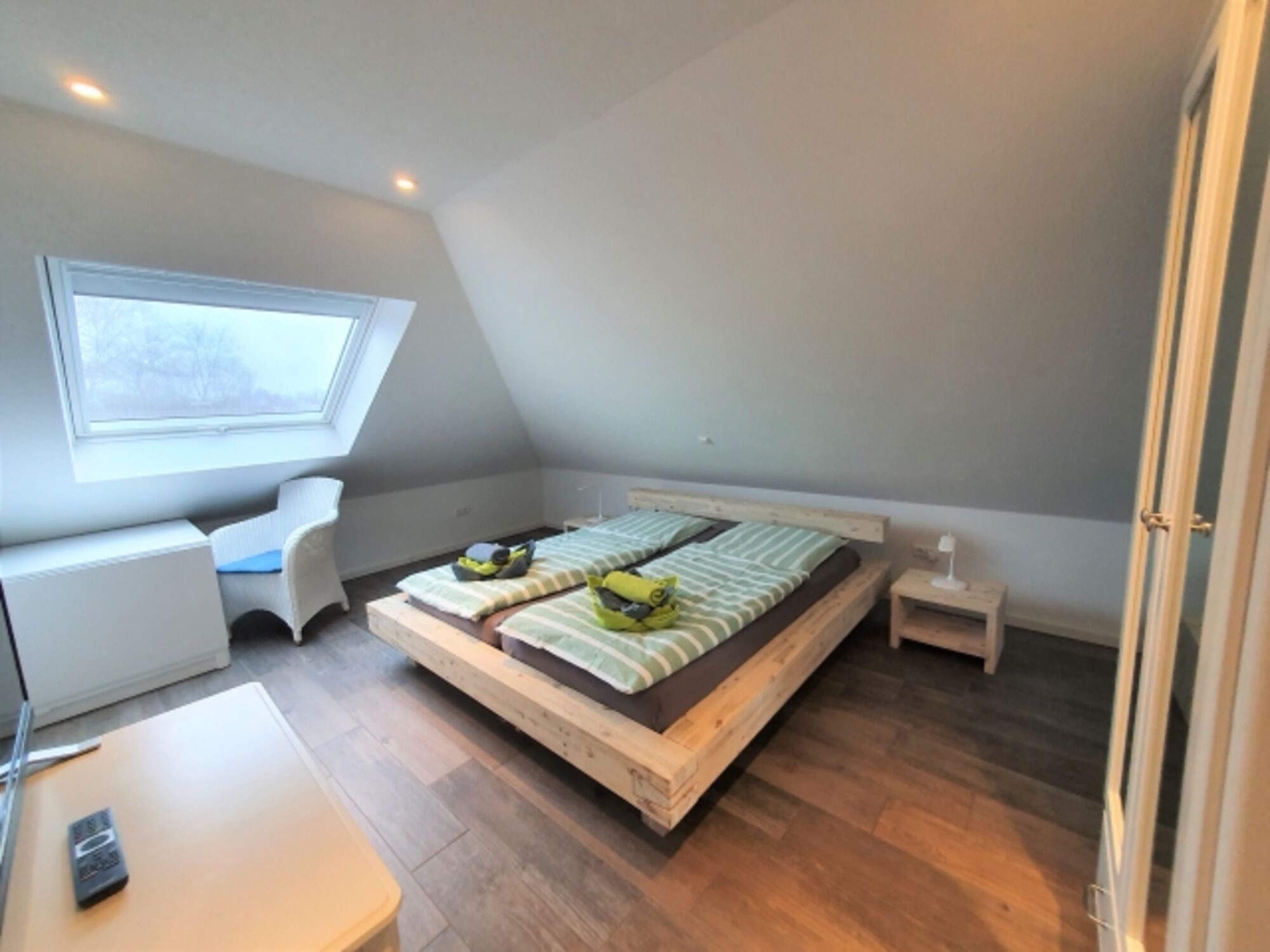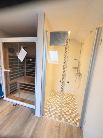 Über eine Treppe erreichen Sie das Obergeschoss, wo noch ein Schlafzimmer mit Doppelbett zur Verfügung steht. Hier befindet sich ein weiteres Duschbad mit einer Infrarotwärmekabine. Hier kann man Wärme tanken.