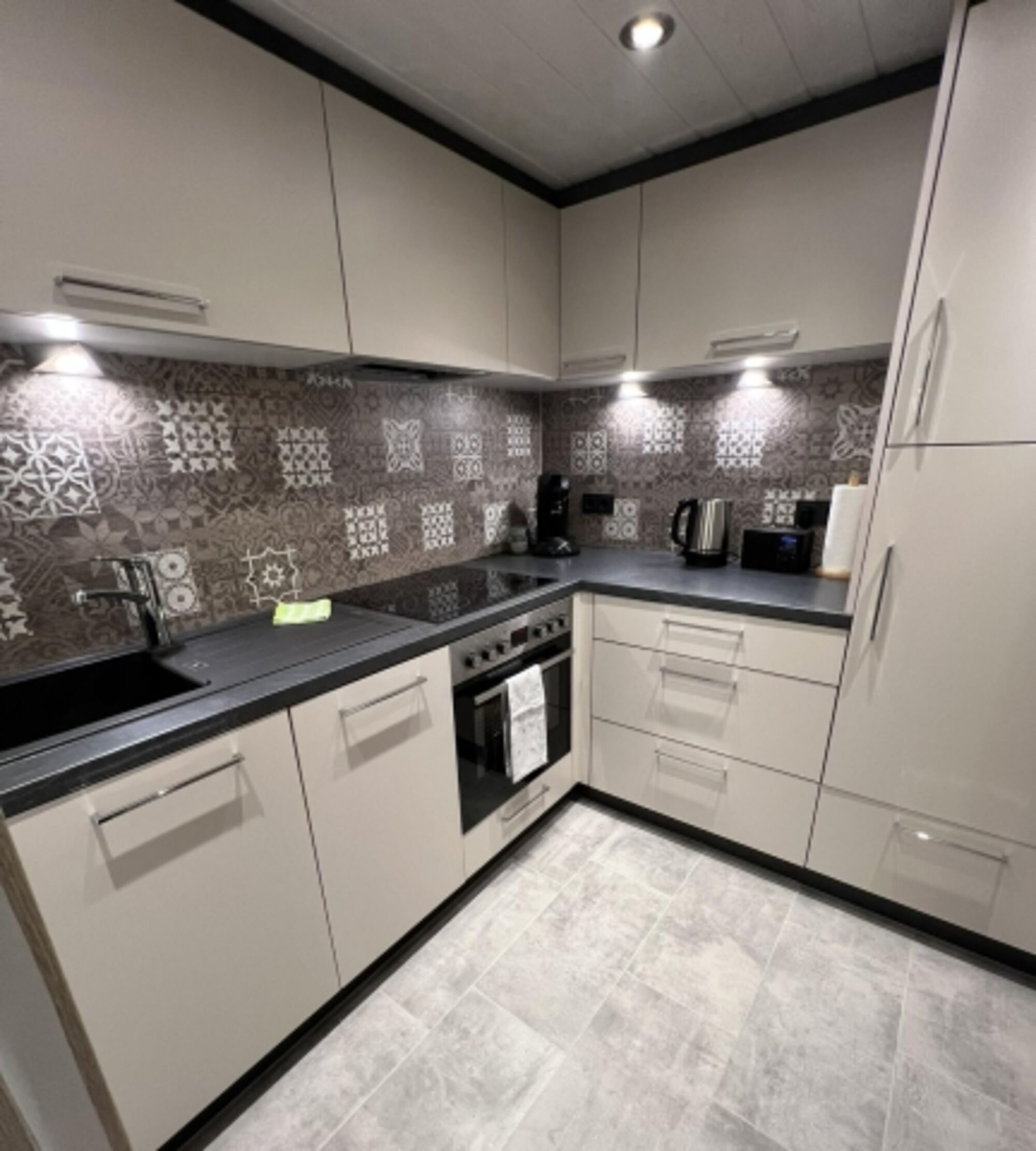 4-Platten Herd, Cerankochfeld, Dunstabzugshaube, Kühlschrank mit Gefrierfach, Gefrierschrank, Senseo-Kaffeeautomat, Eierkocher, Mixer, Waffeleisen, Korkenzieher / Flaschenöffner, Gewürze (Salz, Pfeffer, Zucker), Öl / Essig, Geschirrhandtücher, Mülltüten