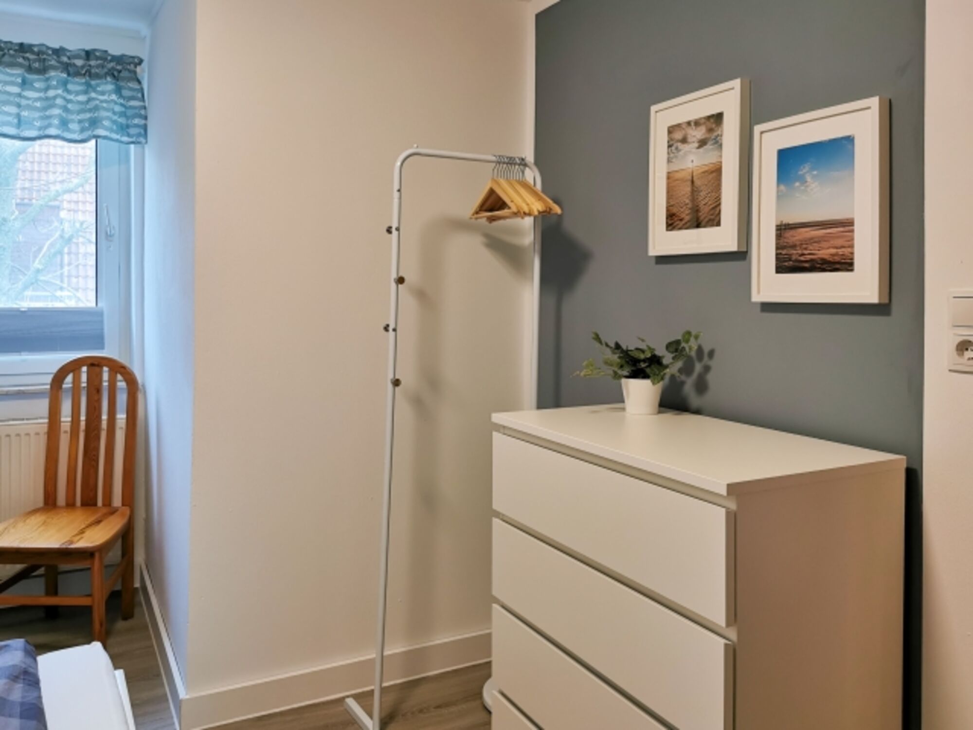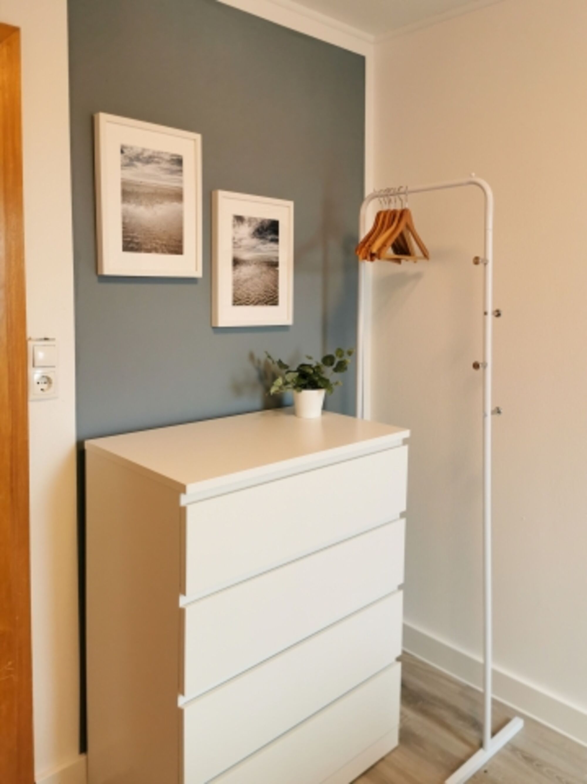 Kleidergarderobe und Stuhl Doppelbett 1,60 x 2,00m, Kommode, Spiegel, Leselampe am Bett