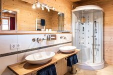 Doppelwaschbecken, Massagedusche, Regendusche, Kosmetiktücher, Dampfbad, Spiegel, Fenster im Bad