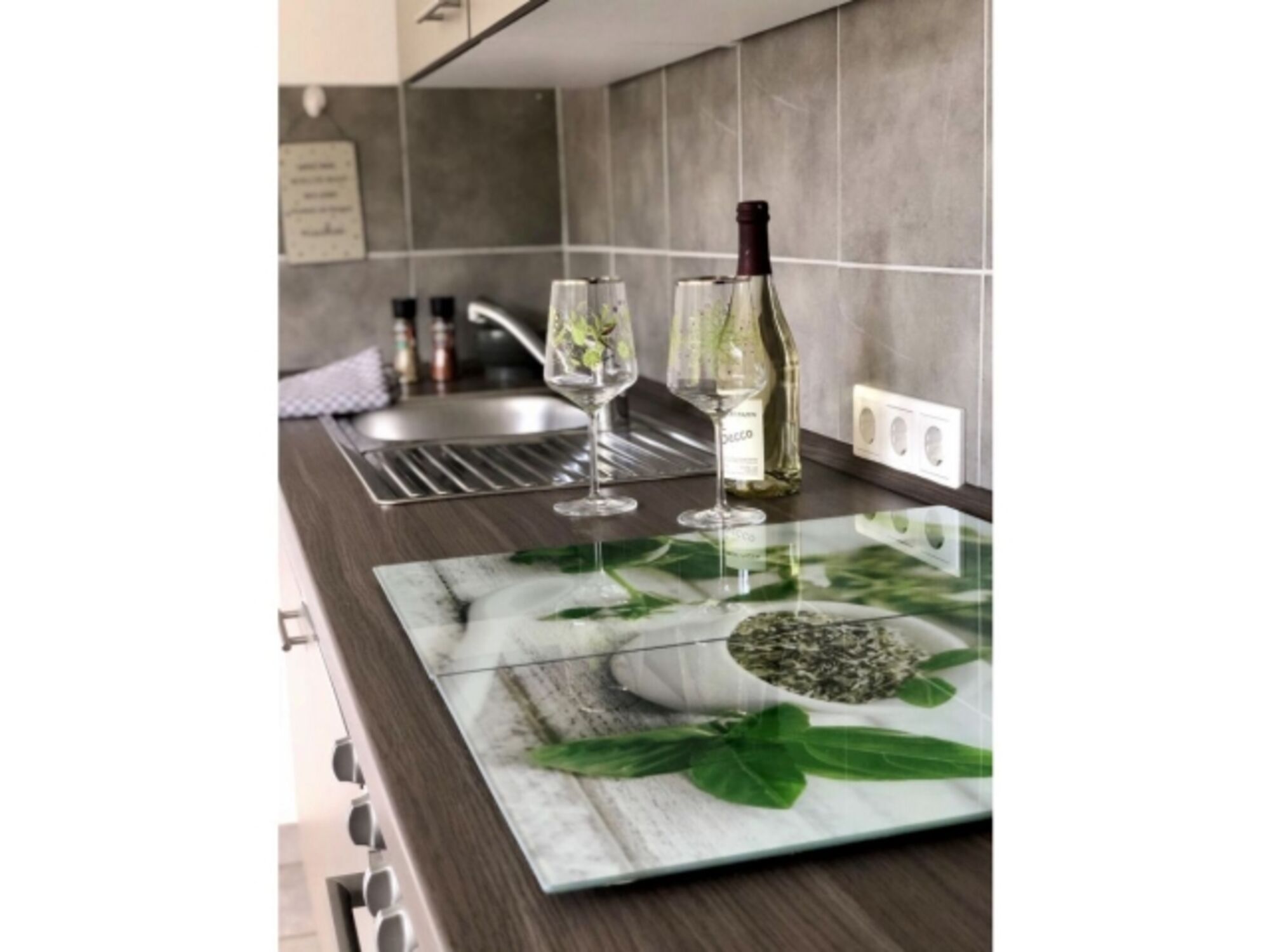 Cerankochfeld, Dunstabzugshaube, Kühlschrank mit Gefrierfach, Gefrierschrank, Kaffeevollautomat, Senseo-Kaffeeautomat, Eierkocher, Mixer, Elekt. Fruchtpresse, Korkenzieher / Flaschenöffner, Gewürze (Salz, Pfeffer, Zucker), Geschirrhandtücher, Mülltüten, Essplatz in der Küche