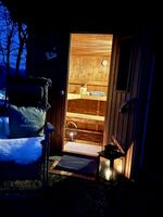 Direkt vor der Wohnung können Sie auf der rustikalen Sitzecke Ihren Kaffee genießen oder auf einer Waldliege im Garten entspannen.