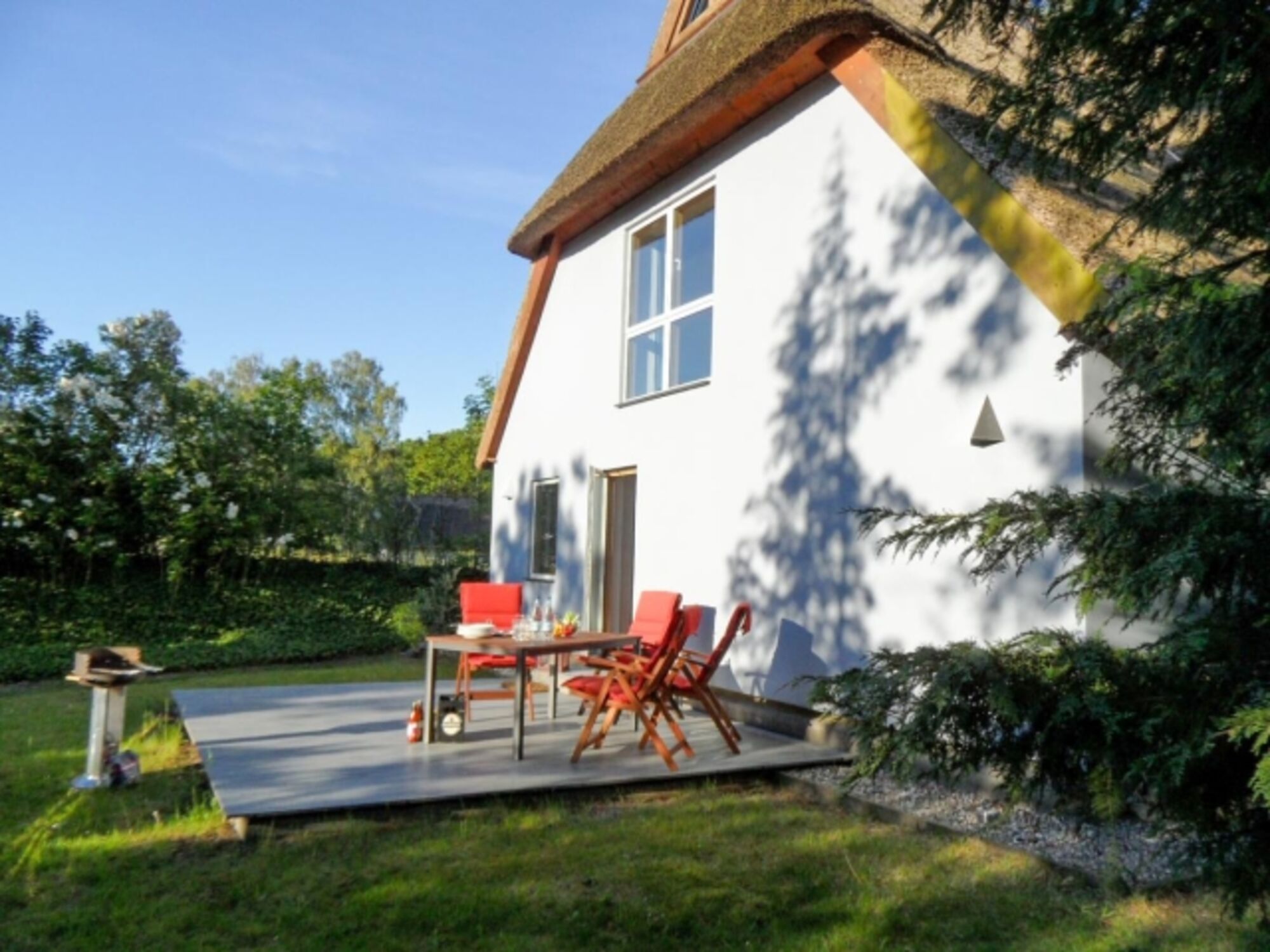 Gepflegtes Reetdachhaus auf großem Grundstück mit Badewanne und Terrasse