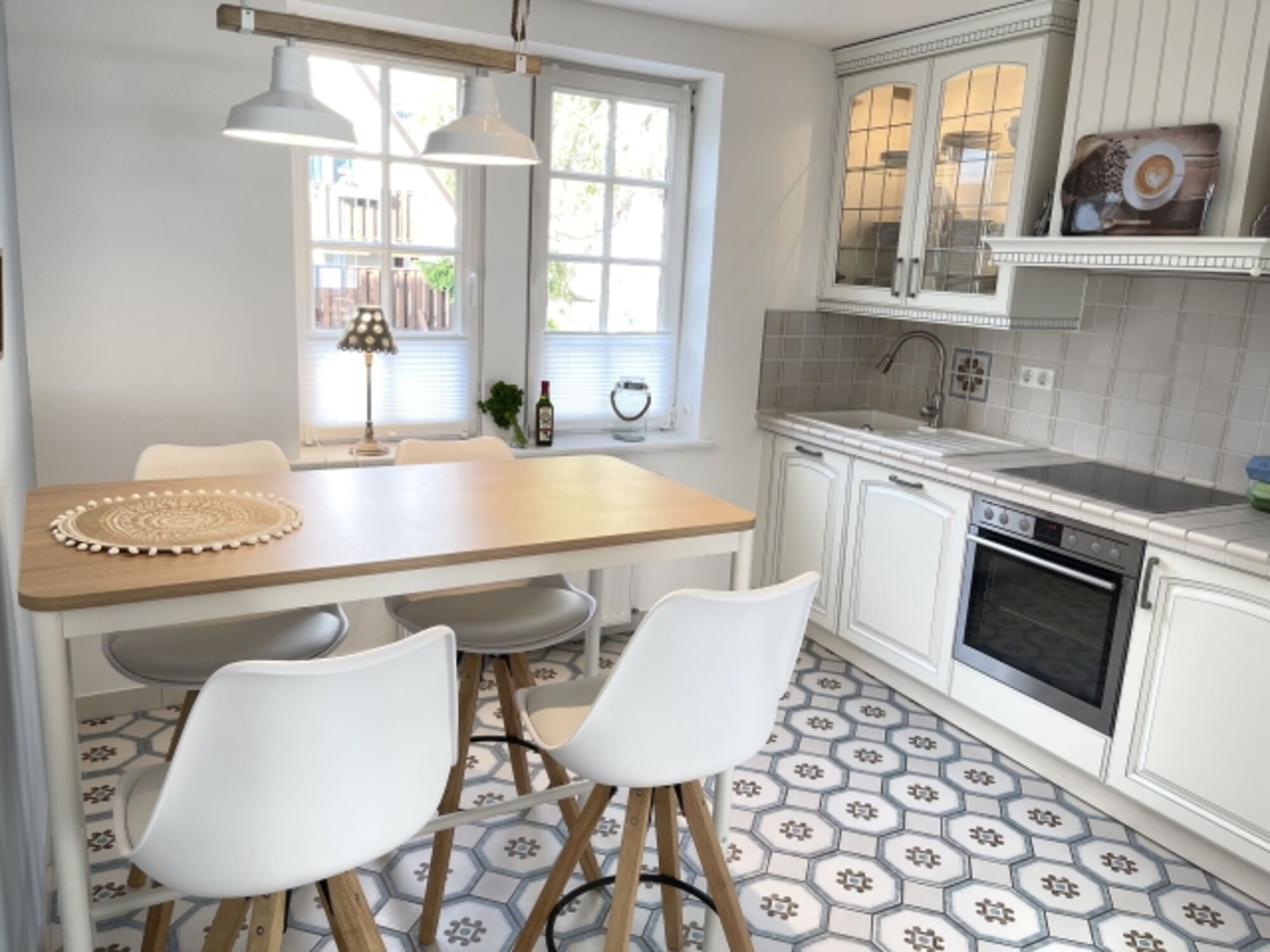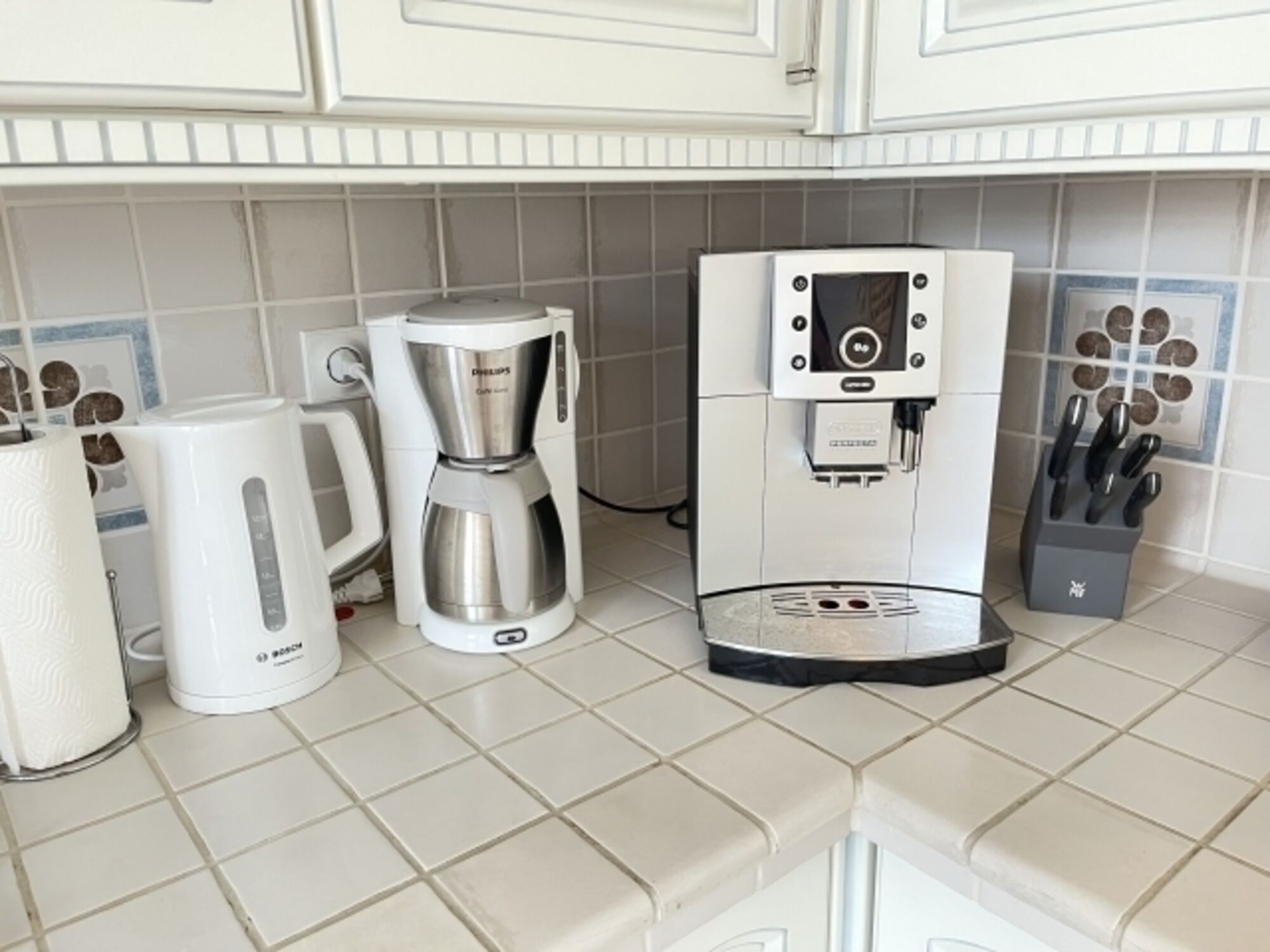 4-Platten Herd, Cerankochfeld, Dunstabzugshaube, Kühlschrank mit Gefrierfach, Gefrierschrank, Kaffeevollautomat, Mixer, Korkenzieher / Flaschenöffner, Gewürze (Salz, Pfeffer, Zucker), Öl / Essig, Geschirrhandtücher, Mülltüten, Essplatz in der Küche