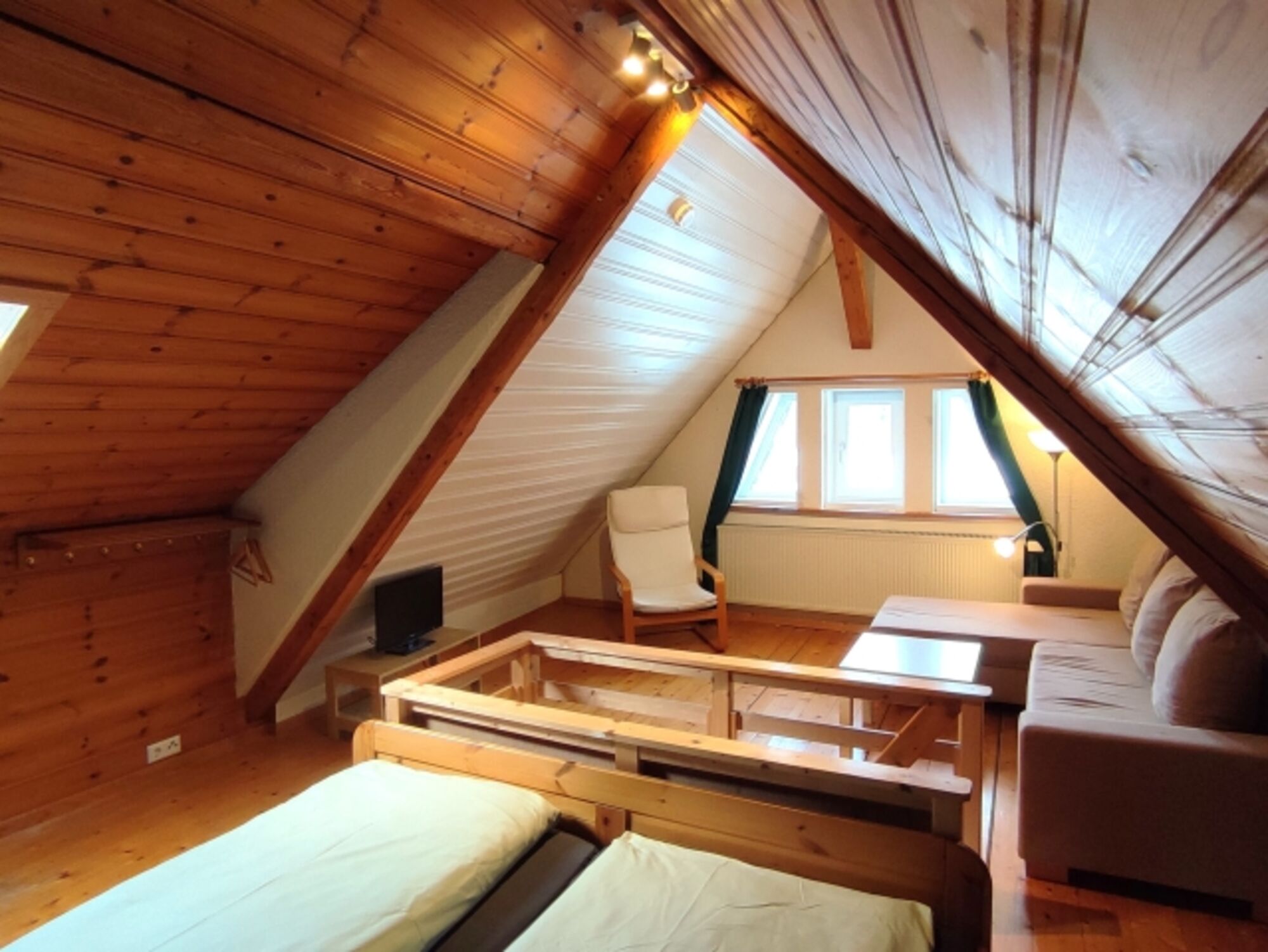 Das Schlafzimmer 3 'Sternenblick', liegt gemütlich unterm Dach, bietet einen weiteren Wohnbereich mit Sitzecke und weiterem TV und ist ein echter 'Wohlfühlraum'! Bitte beachten Sie: Dieser Raum steht nur bei Buchung beider Etagen zur Verfügung und ist durch die steile Treppe für Hunde nicht geeignet.